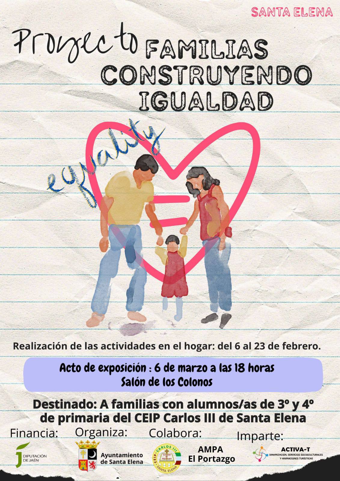 El día 6, se hablará de la igualdad en la familia. Actividad dirigida por Mari Carmen, Activa-T y patrocinada por Diputación, área de Igualdad. Con la colaboración de CEIP Carlos III de Santa Elena y el AMPA.