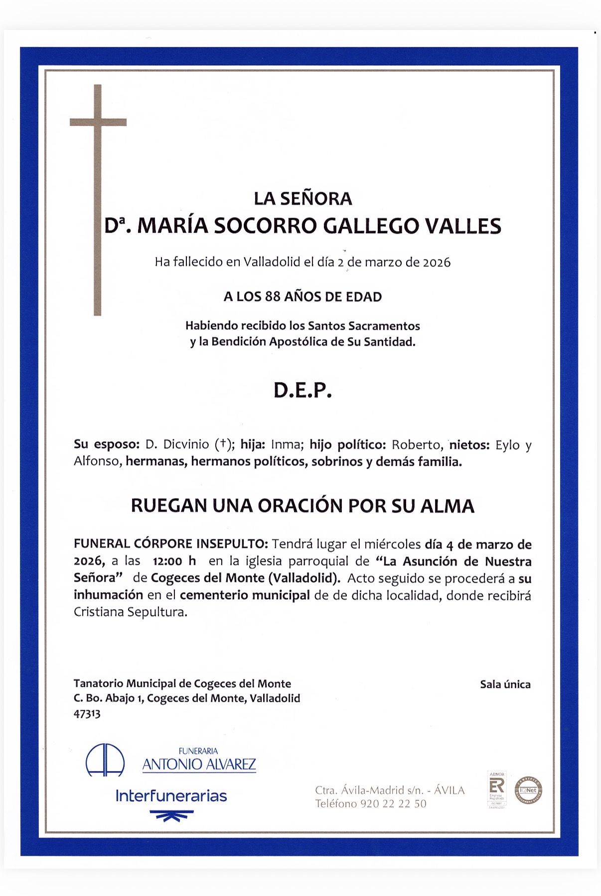 FUNERAL CÓRPORE INSEPULTO: Tendrá lugar el miércoles día 4 de marzo de 2026, a las 12:00 h en la iglesia parroquial de "Nuestra Señora de la Asunción” de Cogeces del Monte (Valladolid). Acto seguido se procederá a su inhumación en el cementerio municipal de la localidad.
