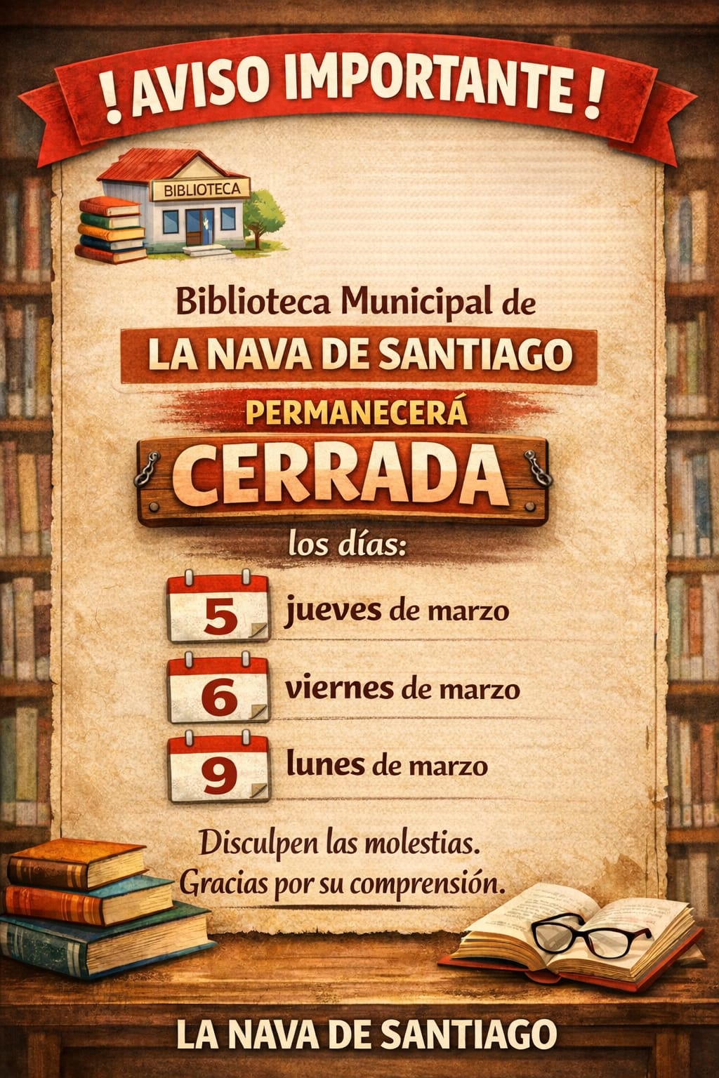 Se informa que los días 5, 6 y 9 de marzo la Biblioteca Municipal permanecerá cerrada.Disculpen las molestias.Gracias por su comprensión.