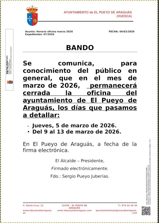 📢 Se comunica, para conocimiento del pĂşblico en general, que en el mes de marzo de 2026, permanecerá cerrada la oficina del ayuntamiento de El Pueyo de Araguás, los dĂas que pasamos a detallar: