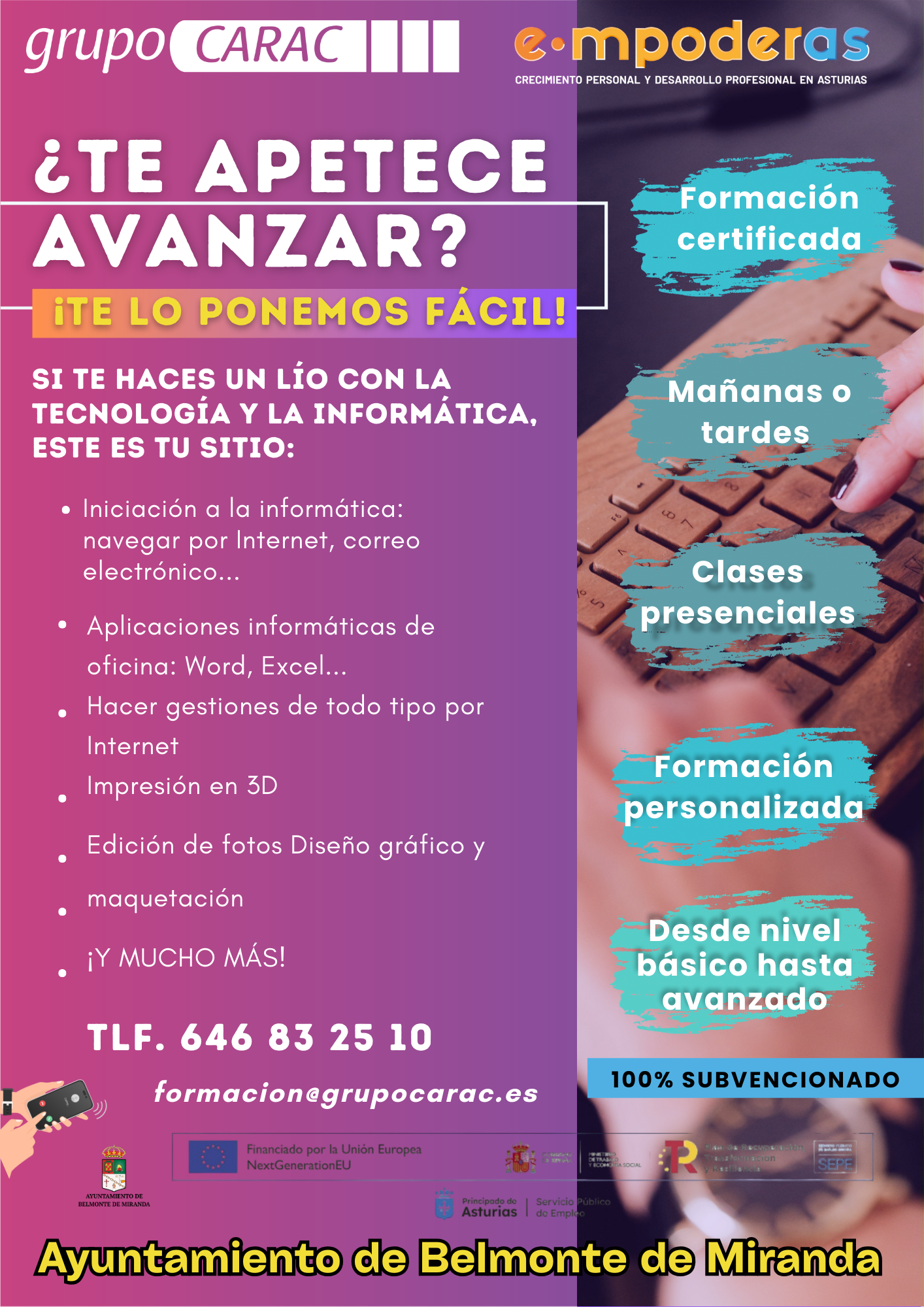 El Ayuntamiento de Belmonte de Miranda junto con el grupo CARAC ofrece una formación gratuita en competencias digitales dirigida a vecinas y vecinos que quieran mejorar su manejo del ordenador y realizar gestiones por Internet.