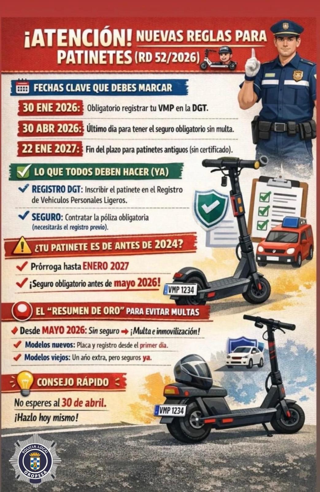 Desde la Policía Local se informe de las NUEVAS REGLAS PARA PATINETES🛴(RD 52/2026)