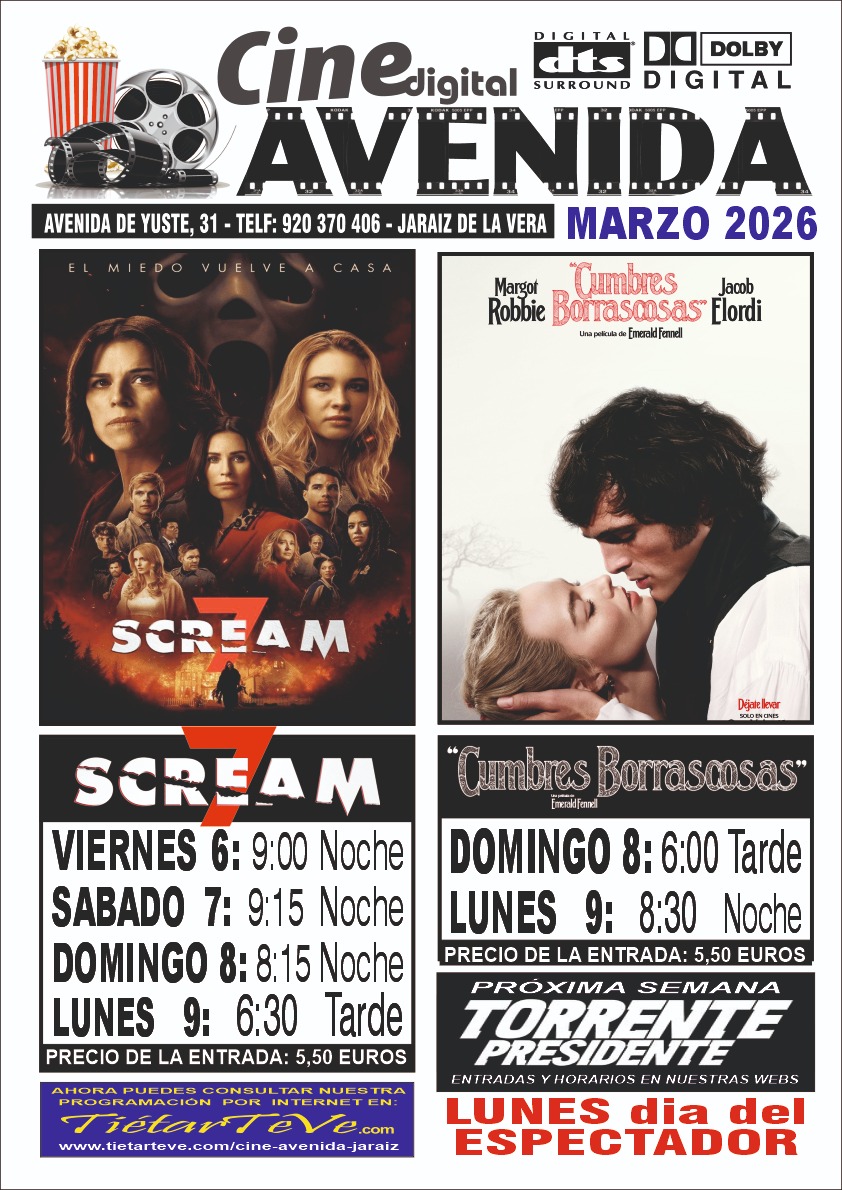"SCREAM 7" y "CUMBRES BORRASCOSAS" en el Teatro Cine Avenida de Jaraíz de la Vera, hasta el lunes 9 de marzo de 2026.