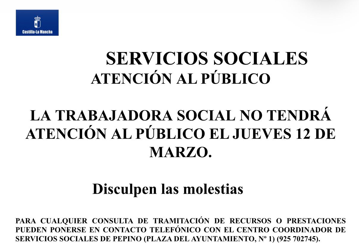 - PARA CUALQUIER CONSULTA DE TRAMITACIÓN DE RECURSOS O PRESTACIONES PUEDEN PONERSE EN CONTACTO TELEFÓNICO CON EL CENTRO COORDINADOR DE SERVICIOS SOCIALES DE PEPINO (PLAZA DEL AYUNTAMIENTO, Nº 1) (925 702745).