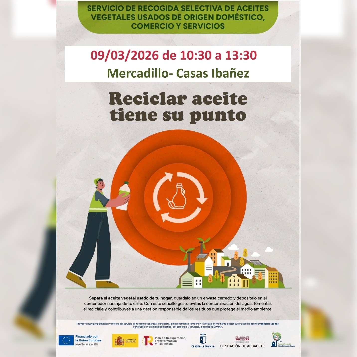 Campaña informativa sobre recogida selectiva, recuperación y reciclaje de aceite vegetal usado, así como instalación de nuevos contenedores de recogida