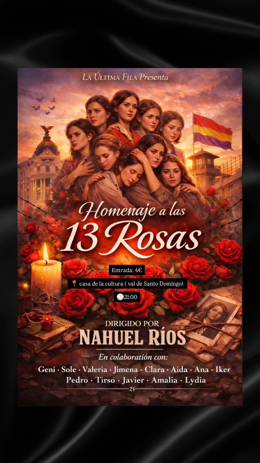 Os recordamos que el sábado 14 de marzo se representará en la Casa de la Cultura Salomé Díaz Rodríguez la obra musical "Homenaje a las 13 Rosas" a las 21:00h a cargo del grupo teatral de Maqueda La última Fila . Precio de la entrada. 4€