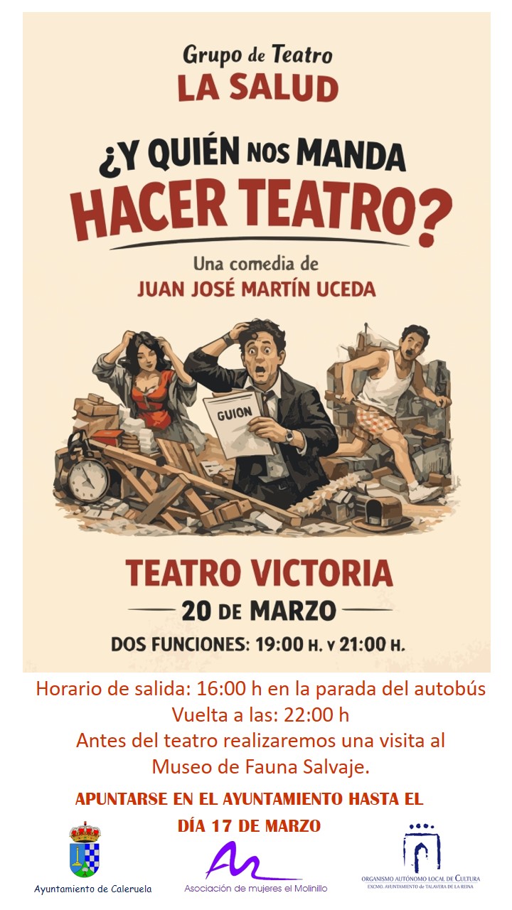 El viernes, 20 de marzo de 2026, se organiza una excursi贸n a Talavera. Primero visitaremos el Museo de Fauna Salvaje y, a continuaci贸n, asistiremos a la obra "驴Y qui茅n nos manda hacer teatro?" en el Teatro Victoria (19:00 h).