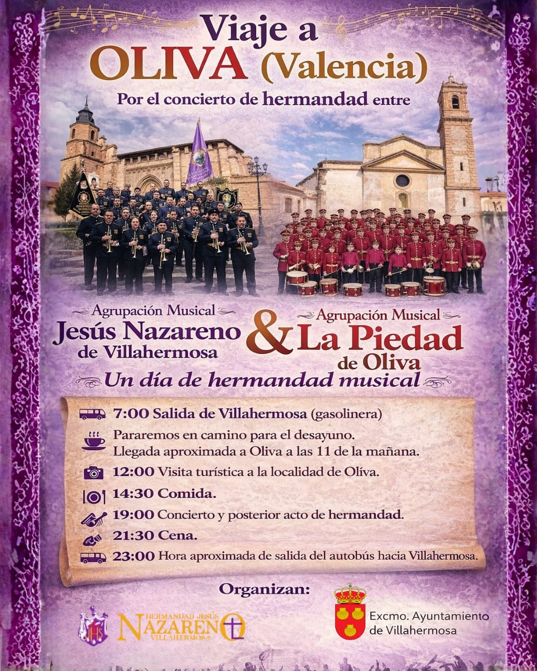 Tal y como ya se anunció, el Ayuntamiento de Villahermosa pone a disposición de los vecinos y vecinas un autobús para viajar a Oliva (Valencia) y acompañar a nuestra Agrupación Musical Jesús Nazareno en el concierto de hermandad que ofrecerá junto a la Agrupación Musical La Piedad de Oliva.