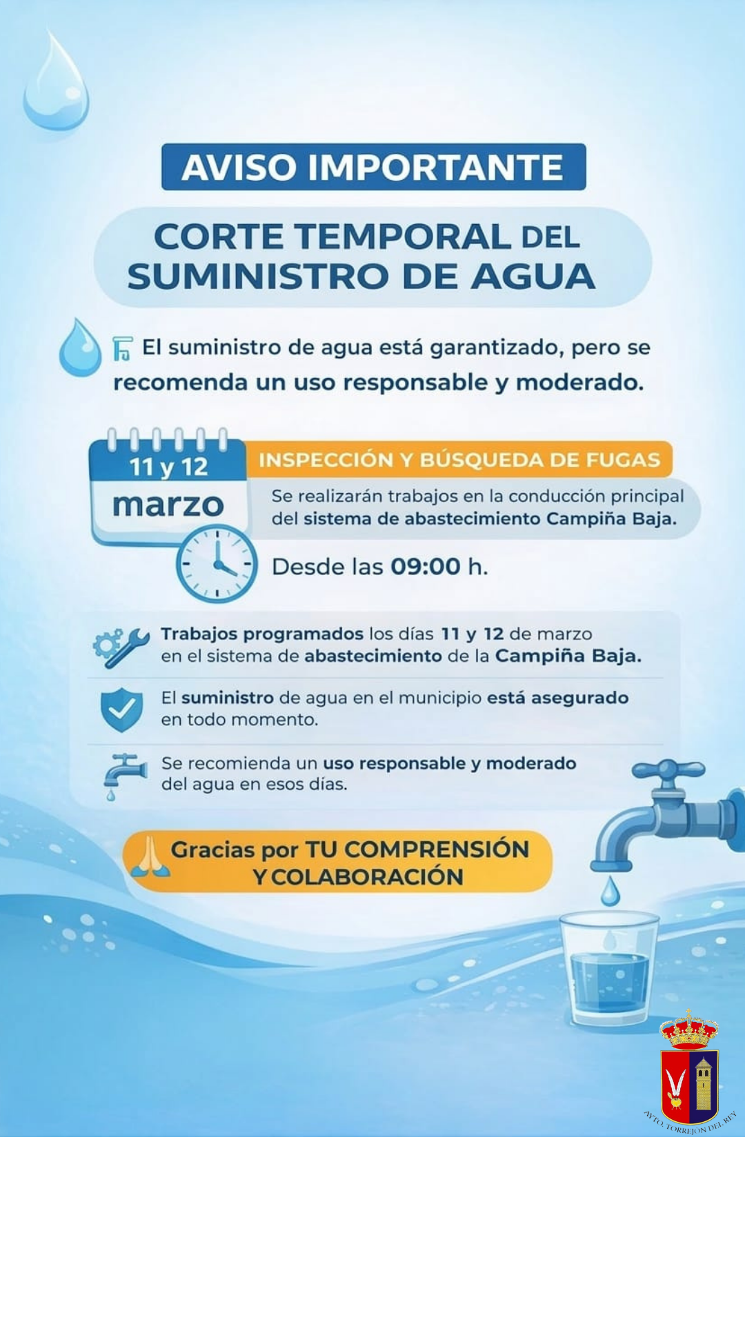 ➡️ El abastecimiento de agua en el municipio está garantizado, ya que el sistema dispone de capacidad de regulación suficiente y se coordinarán las medidas necesarias para mantener el servicio con normalidad. 💧✅