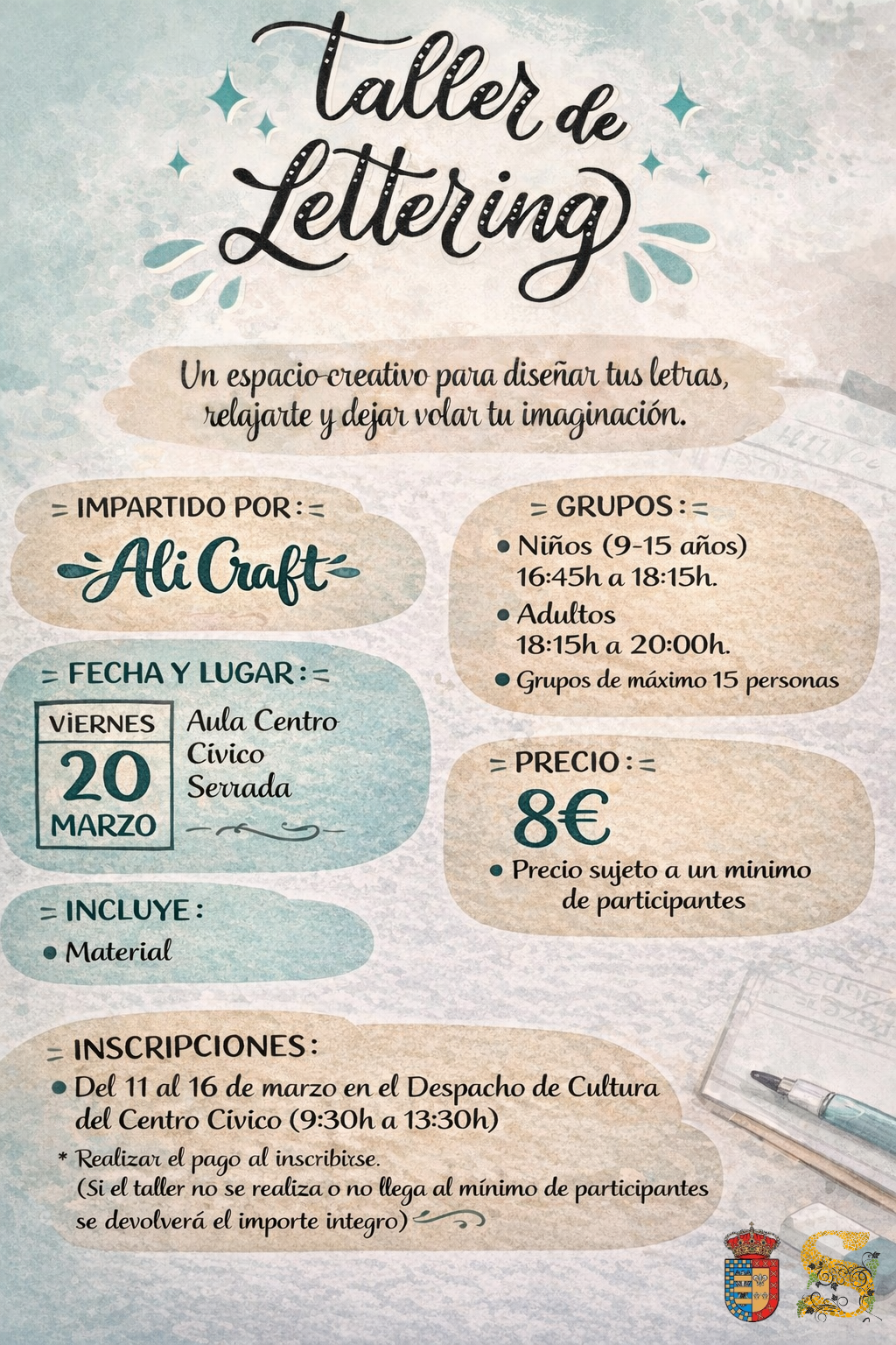 Tendremos una taller para niños y adultos, donde aprenderemos el arte de dibujar letras, aquellas personas interesadas inscribirse desde el 11 al 16 de marzo en el despacho de cultura, las plazas son limitadas y por orden de inscripción. Toda la información restante en el cartel adjunto