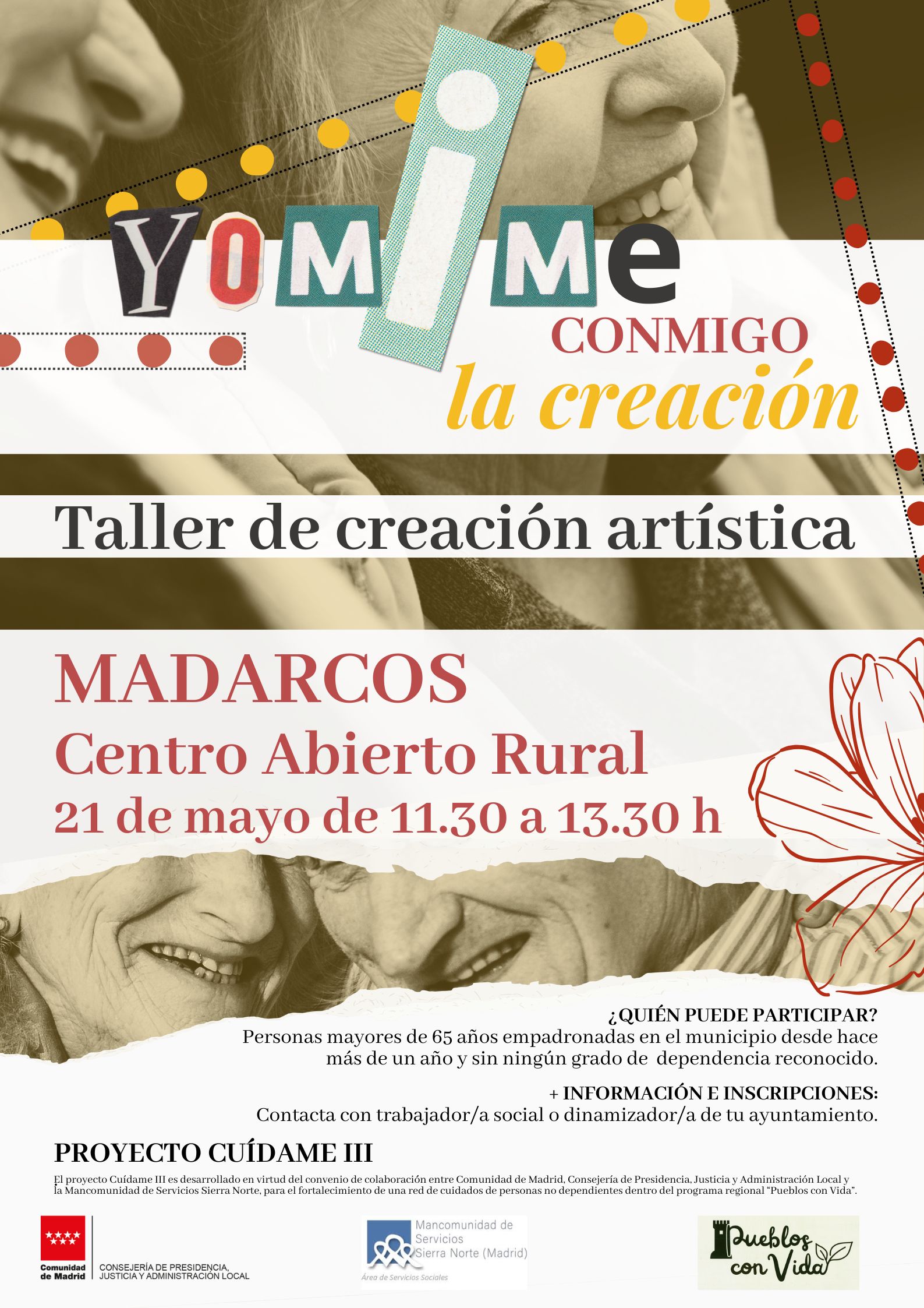 El Ayuntamiento de Madarcos informa de la realización del taller “Yo mimo, conmigo. La creación”, una actividad de creación artística pensada para disfrutar, compartir y estimular la creatividad.