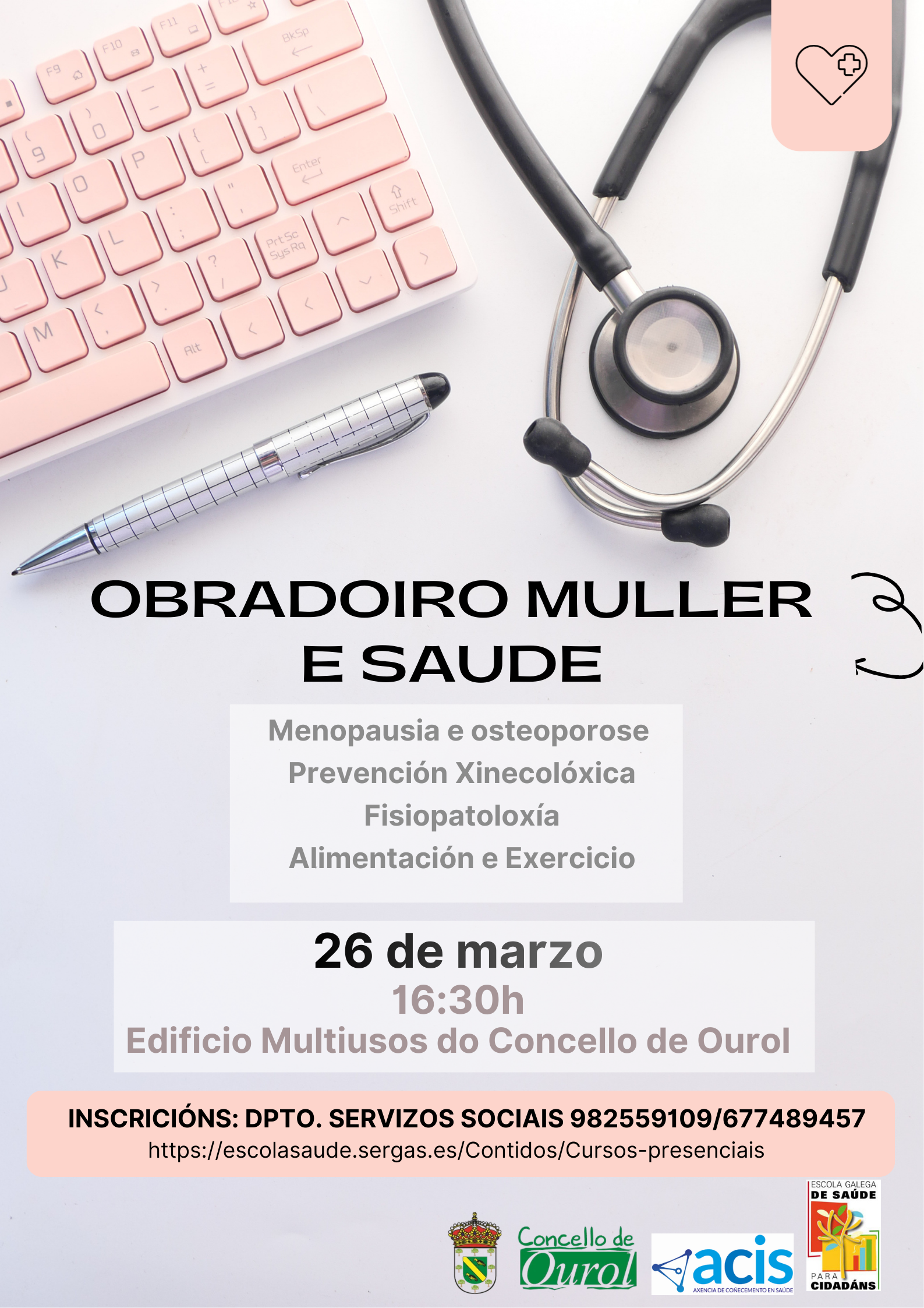 Dende o Concello de Ourol, en colaboración coa Escola Galega de Saúde para Cidadáns, vaise a levar a cabo un OBRADOIRO DE MULLER E SAUDE. Esta actividade vaise a realizar no Edificio Multiusos do Concello o día 26 de MARZO ás 16:30 horas.