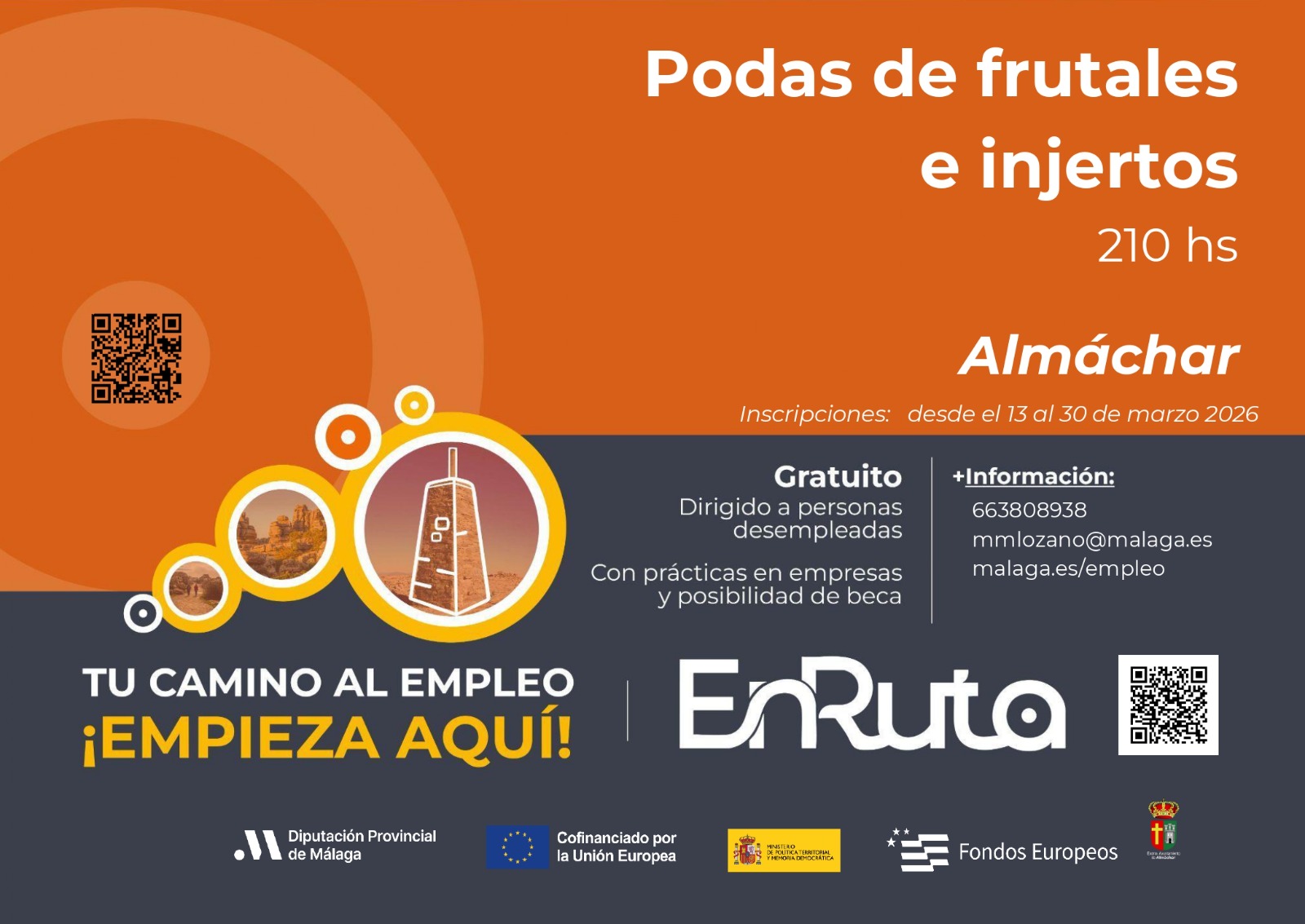 La Diputación Provincial de Málaga, con la cofinanciación del FSE+ a través del Programa de Empleo, Educación, Formación y Economía Social (EFESO) y la colaboración del Ayuntamiento de Almáchar, pone en marcha un curso gratuito de “Poda de frutales e injertos” en nuestro municipio, dentro del Proyecto Proyecto EnRuta.