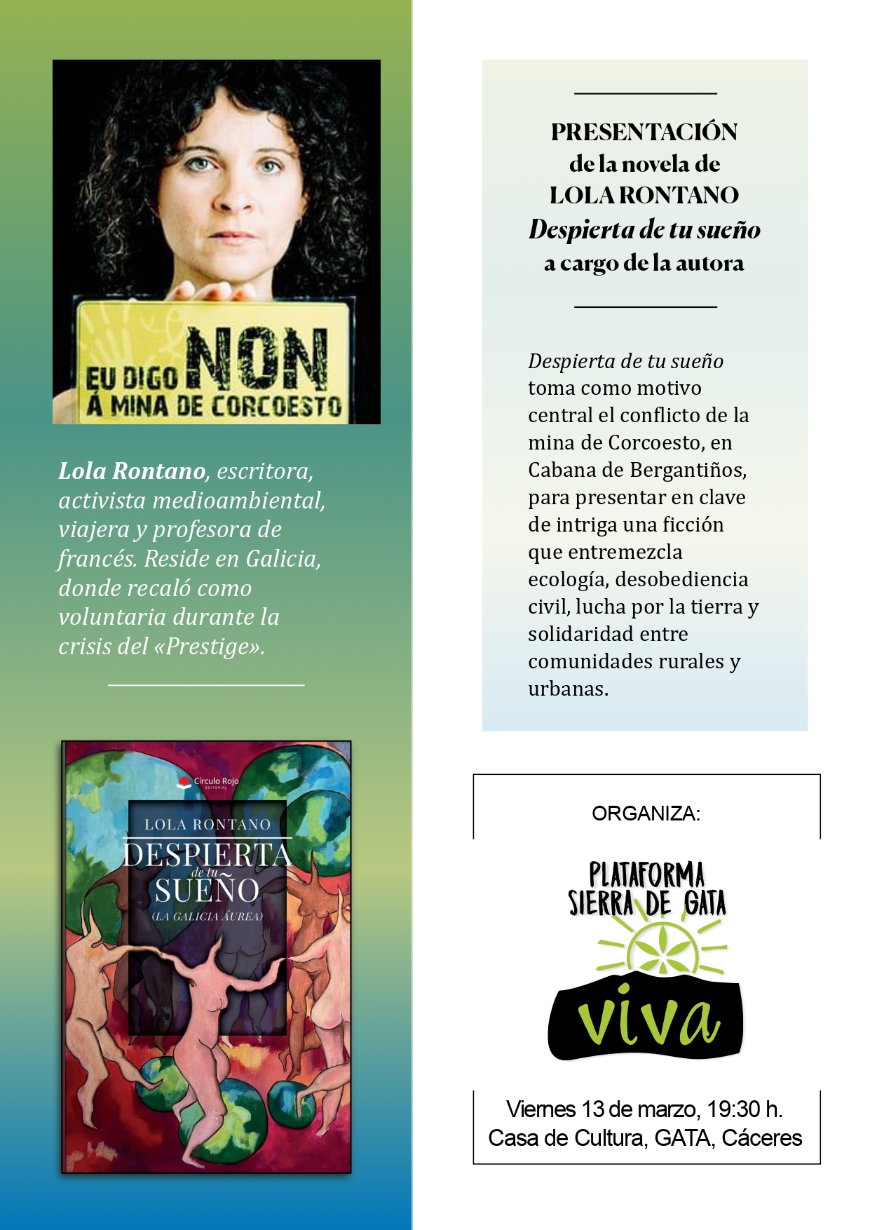 La Plataforma Sierra de Gata Viva organiza la PRESENTACIÓN de novela vinculada con la EXTRACCIÓN MINERA, con asistencia de la autora.Lugar: Casa de Cultura de Gata.Fecha y hora: viernes, 13 de marzo, a las 19:30h.