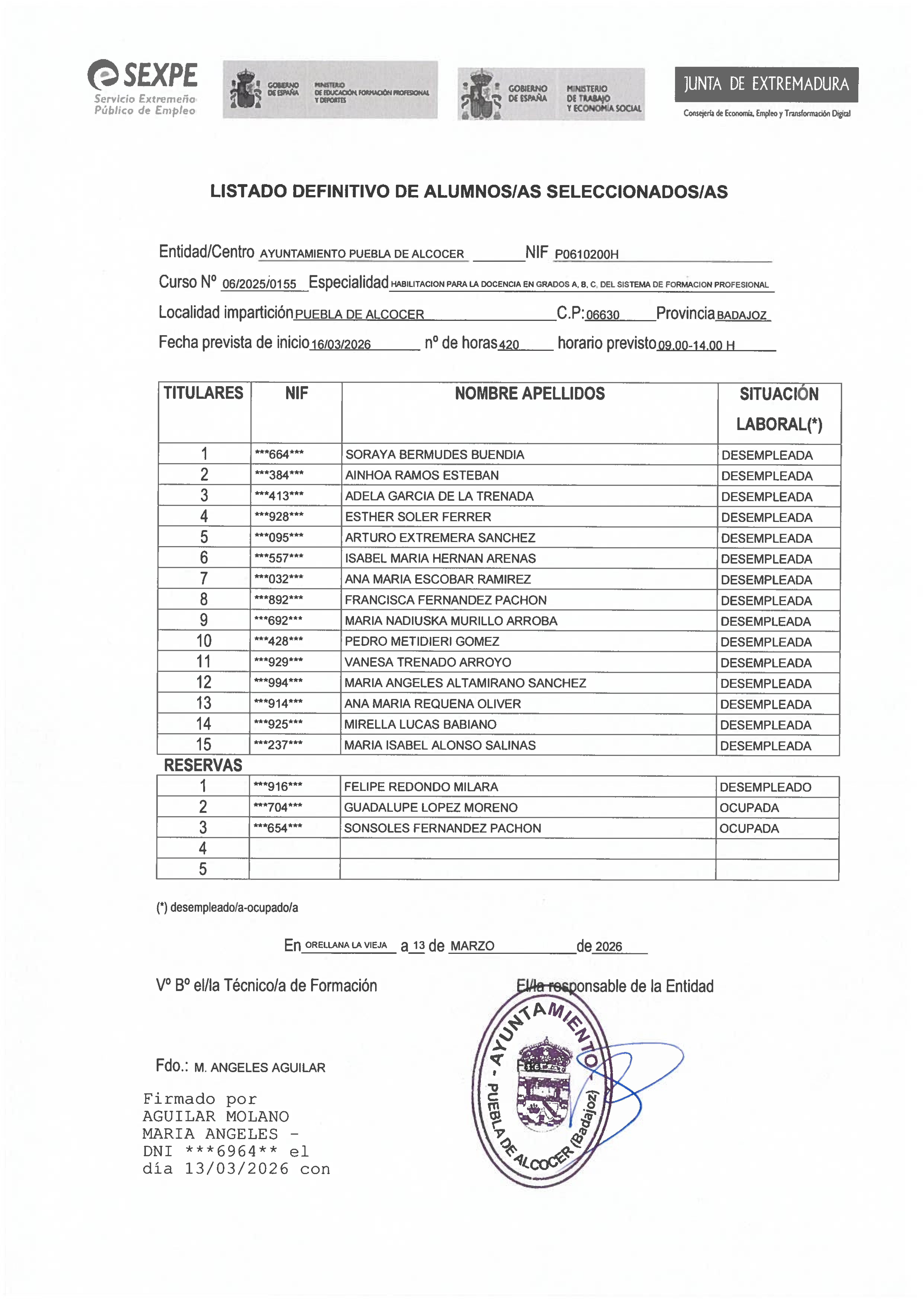 Publicamos el listado definitivo de alumnos seleccionados del curso para desempleados "Habilitación para la docencia en grados A, B y C del sistema de formación profesional".