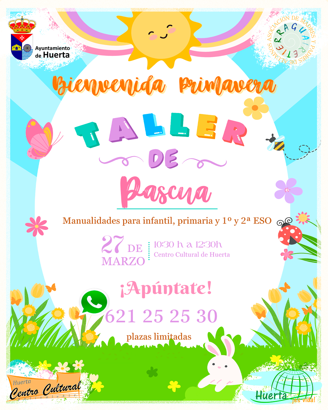 *“Taller de PASCUA”* 🐰🐣🧺🪷🌸💐🌷 Para niños y niñas de infantil, primaria y 1º y 2º ESO Centro Cultural de Huerta - Viernes 27 de marzo de 10:30h a 12:30h Inscripciones por whatsApp 621 25 25 30
