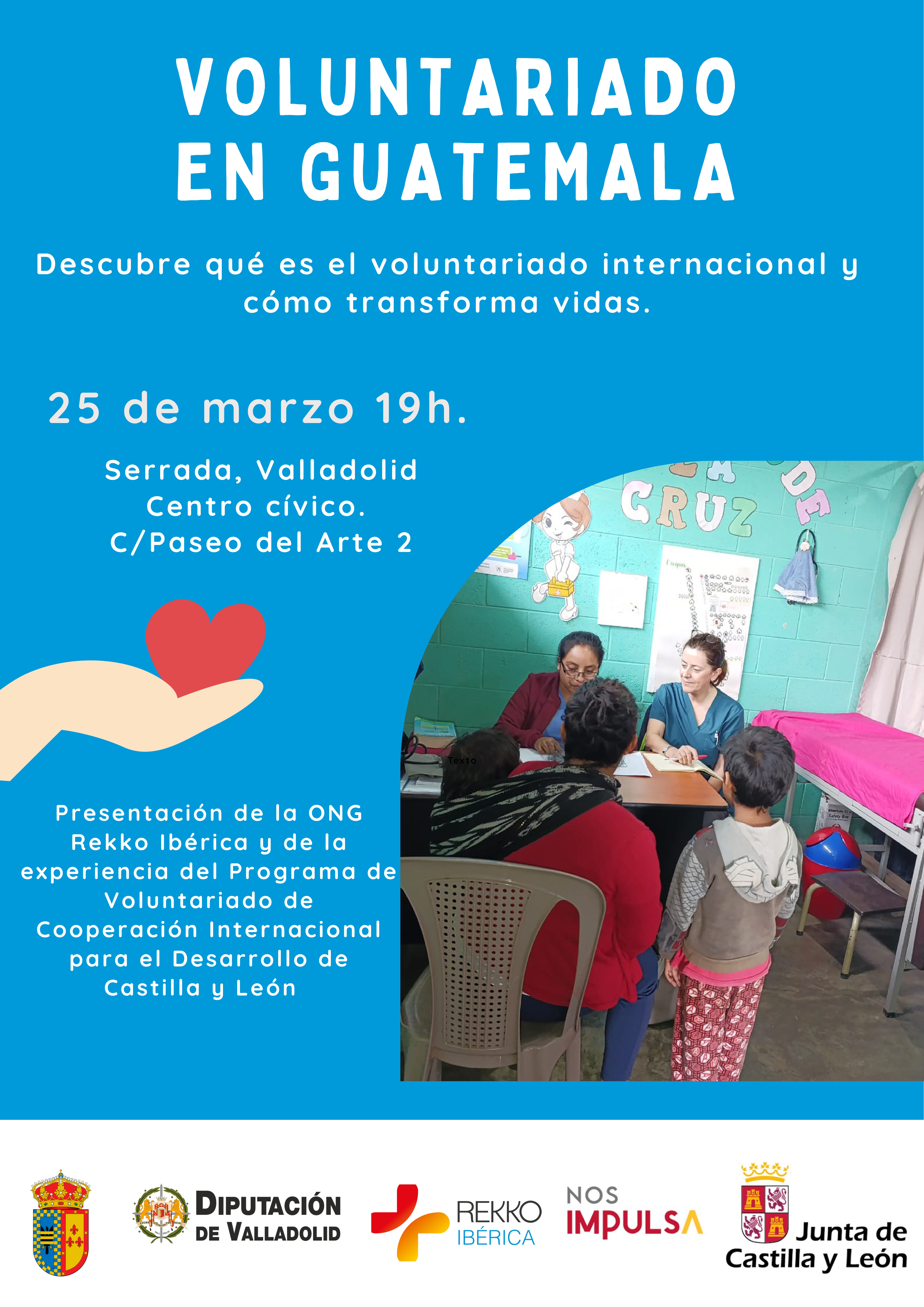 Desde el Ayuntamiento de Serrada, el próximo miércoles 25 de marzo a las 19.00 h en el Teatro Ismael Alonso del Centro Cívico, nos visitara la ONG Rekko Ibérica, la cual nos presentará su proyecto solidaria llevado a cabo en Guatemala, informándonos del voluntariado y las acciones que llevan a cabo en ese país.