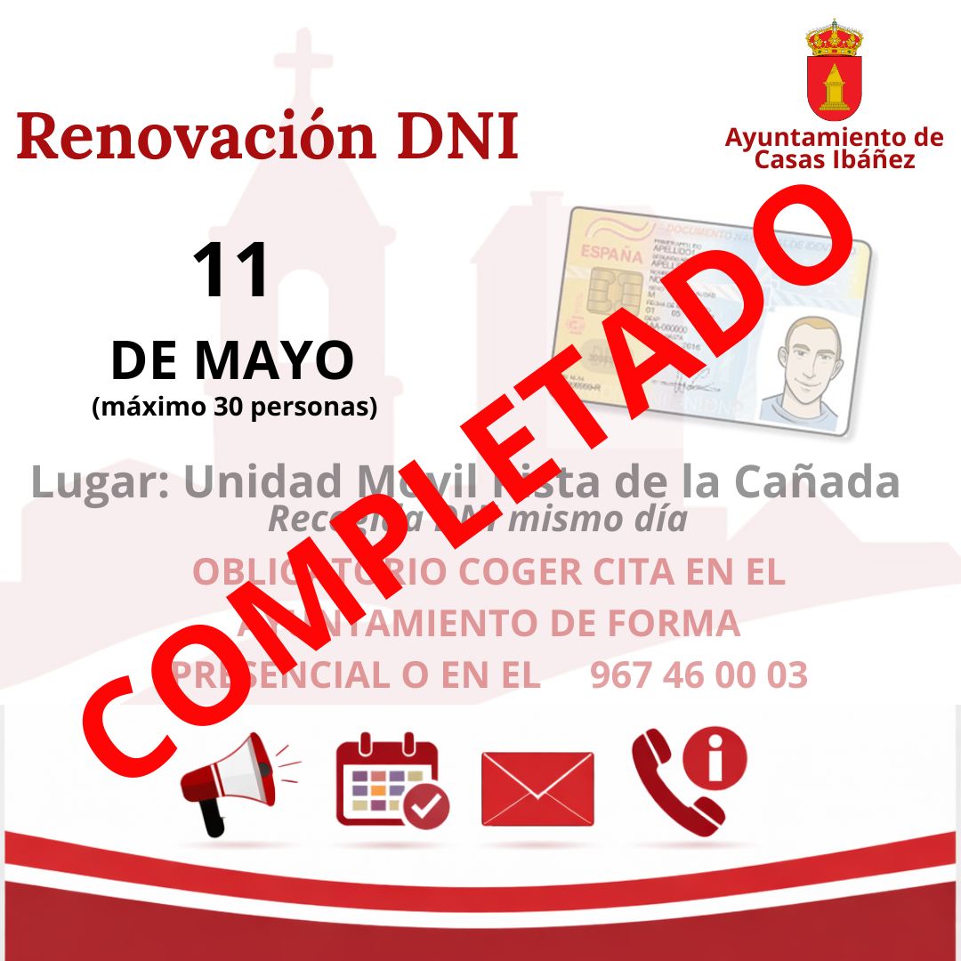 Se informa que ya se ha completado el cupo previsto para la próxima renovación del DNI en nuestra localidad.