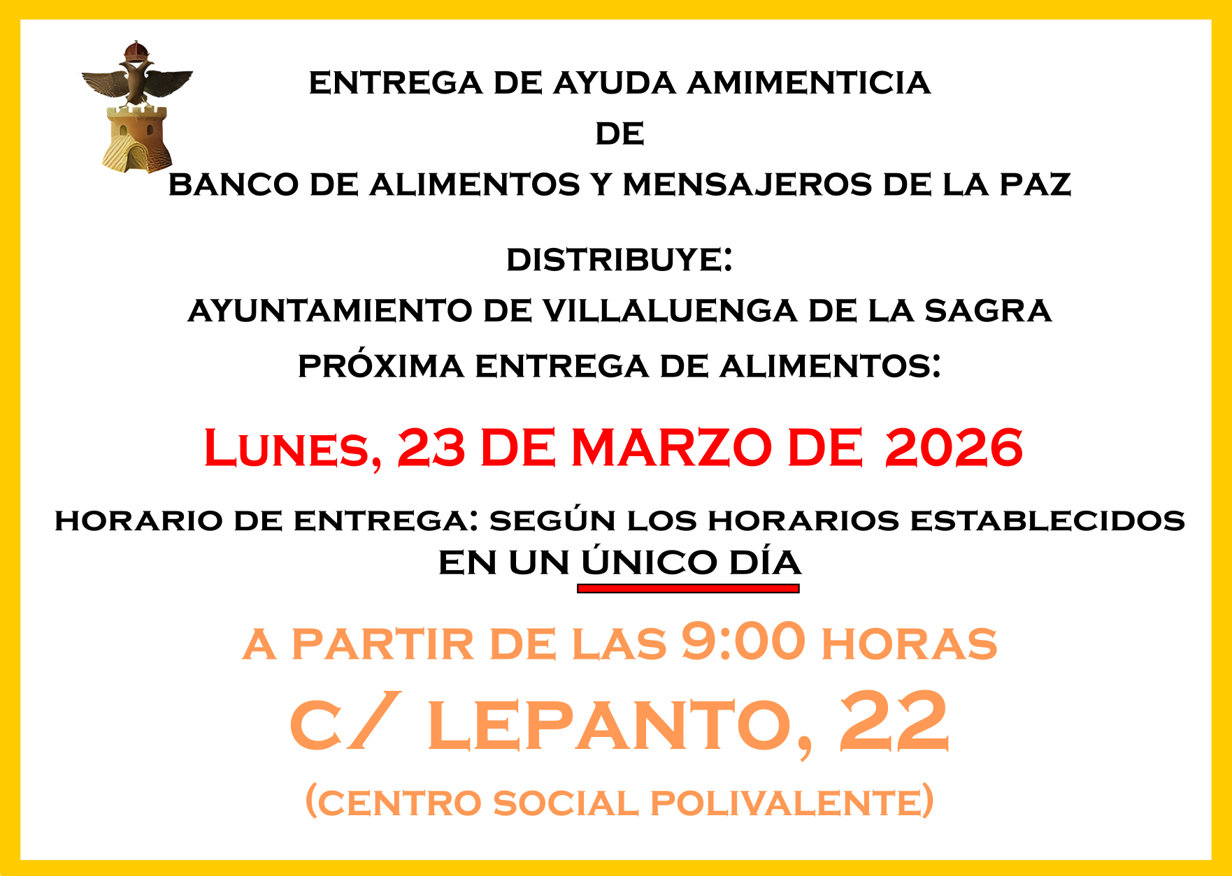 Se comunica que el próximo reparto de alimentos se realizará el próximo LUNES 23 de MARZO de 2026 (ÚNICO DÍA), desde las 9:00 horas en adelante y en la Calle Lepanto, 22 (Centro Social Polivalente).