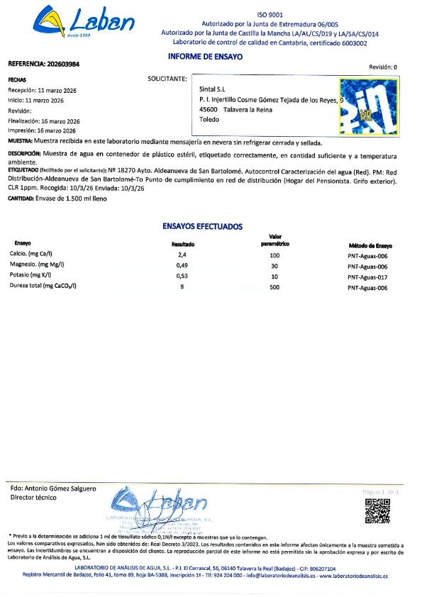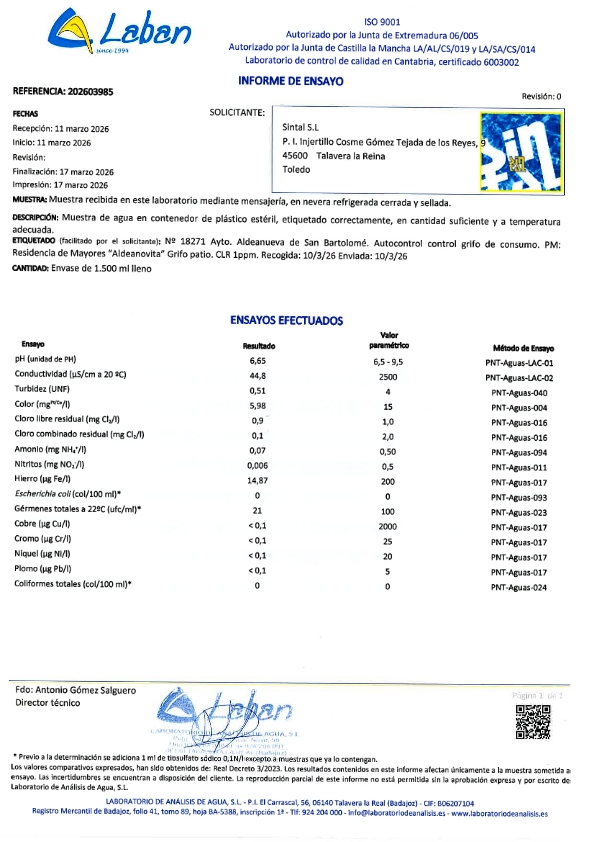 les adjuntamos el último informe de ensayo de la muestra del agua donde se indica especificado la potabilidad de esta en su llegada al depósito.