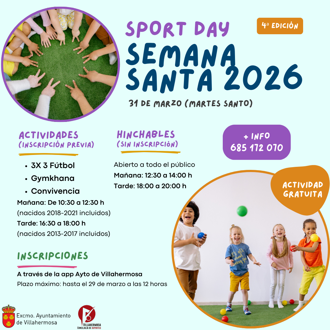 Un año más, los peques de Villahermosa podrán disfrutar esta Semana Santa de un divertido día de juegos, convivencia y actividades deportivas con Gymkhana, 3x3 fútbol, hinchables...ACTIVIDAD GRATUITA