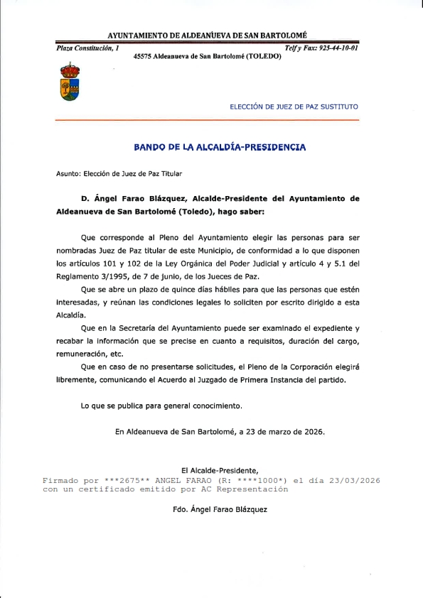 Buenos días,el Ayuntamiento tiene que nombrar a un JUEZ DE PAZ TITULAR para el municipio.Todos los interesados tienen un plazo de 15 días para comunicarlo en las oficinas del Ayuntamiento.Se adjunta bando con la información.