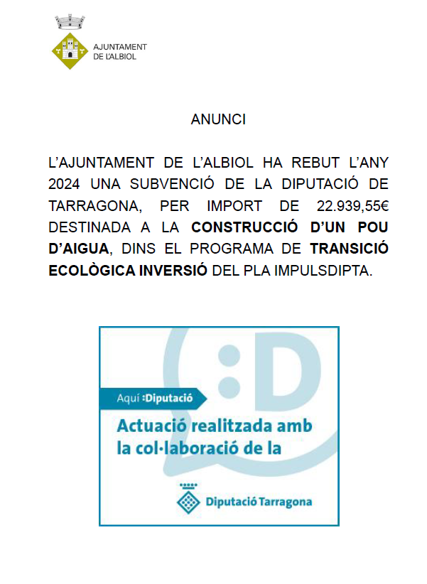 L’Ajuntament de l’Albiol ha rebut una subvenció de 22.939,55 euros, corresponent a l’any 2024, destinada a la construcció d’un pou d’aigua al nucli del municipi. Aquesta actuació s’emmarca dins del programa de transició ecològica d’inversions del Pla #ImpulsDipta.