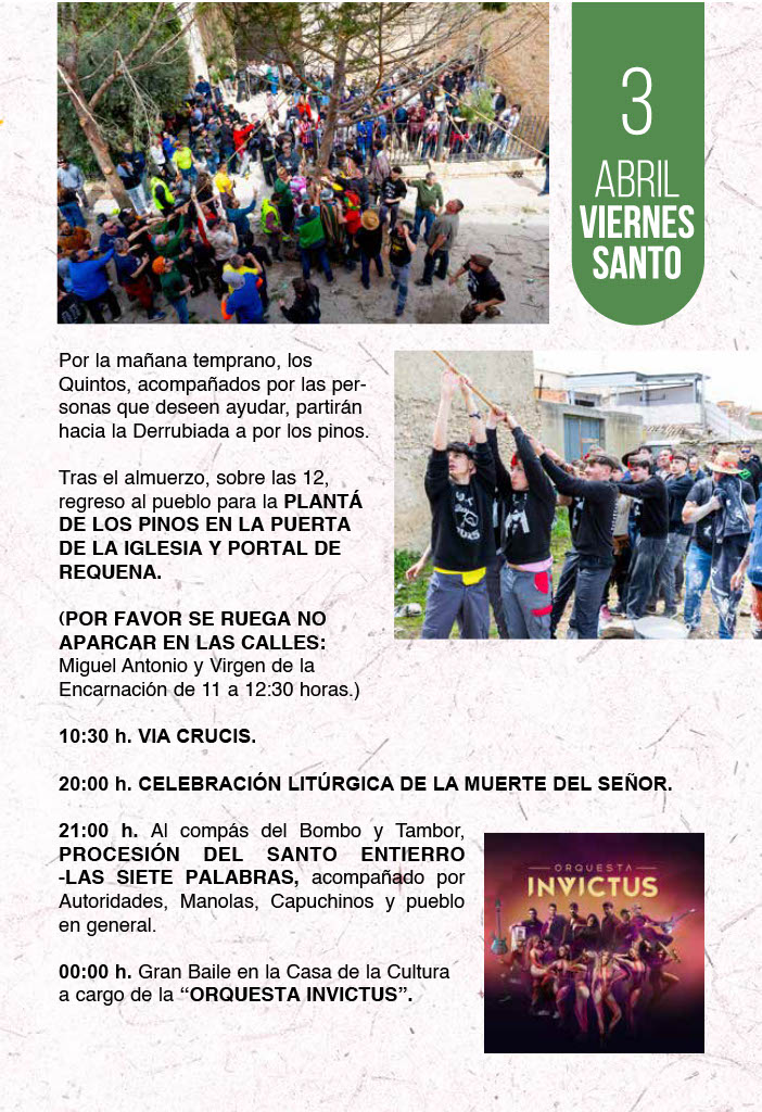 12:00 h Planta de los pinos en la puerta de la iglesia y portal de requena. Añadir que, por favor, no aparcar en las calles Miguel Antonio y Virgen de la Encarnación. Gracias.