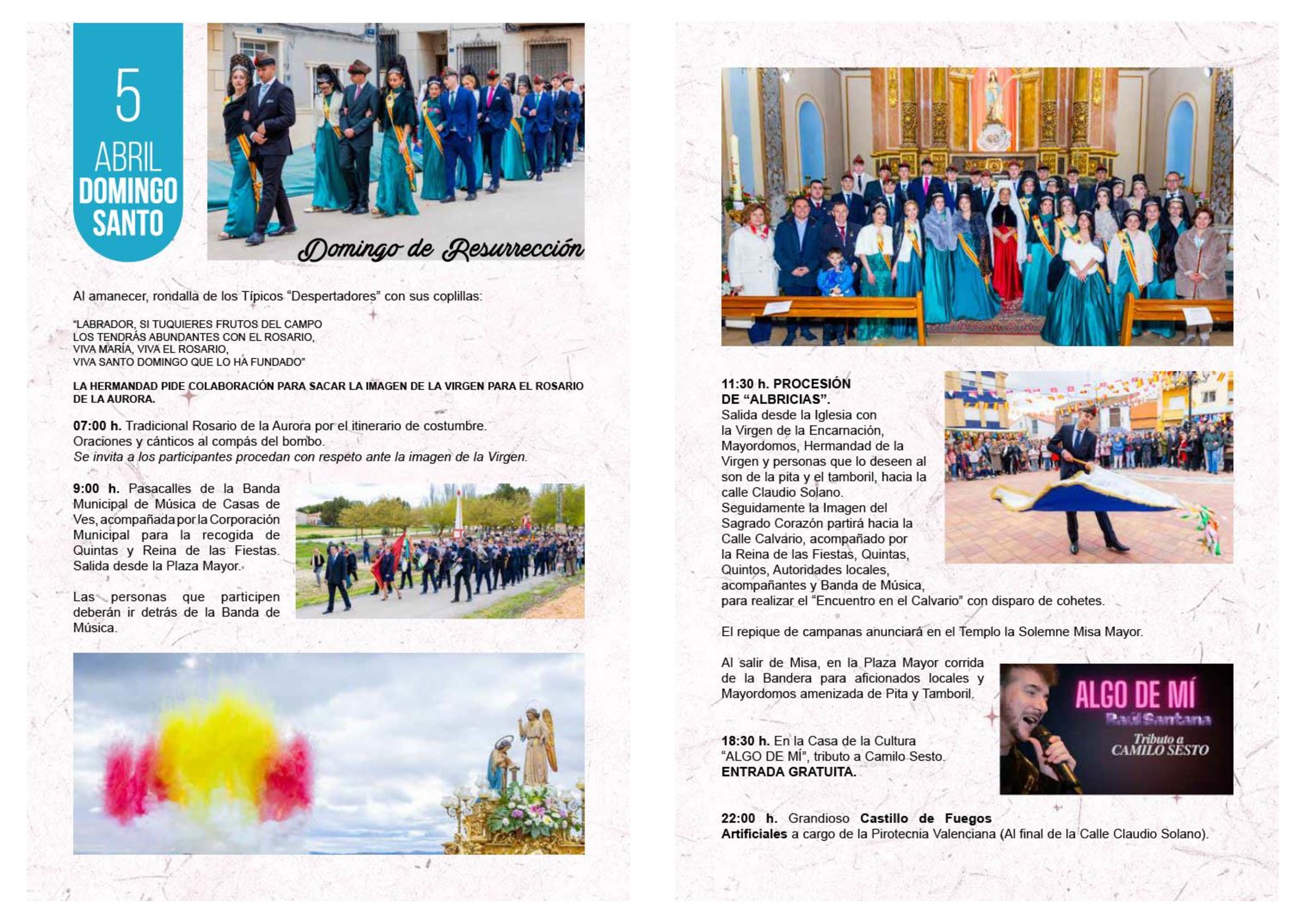 9:00 h Pasas calles de la Banda Municipal de Música de Casas de Ves para la recogida de las Quintas y Reina de las Fiestas (salida desde la Plaza Mayor)