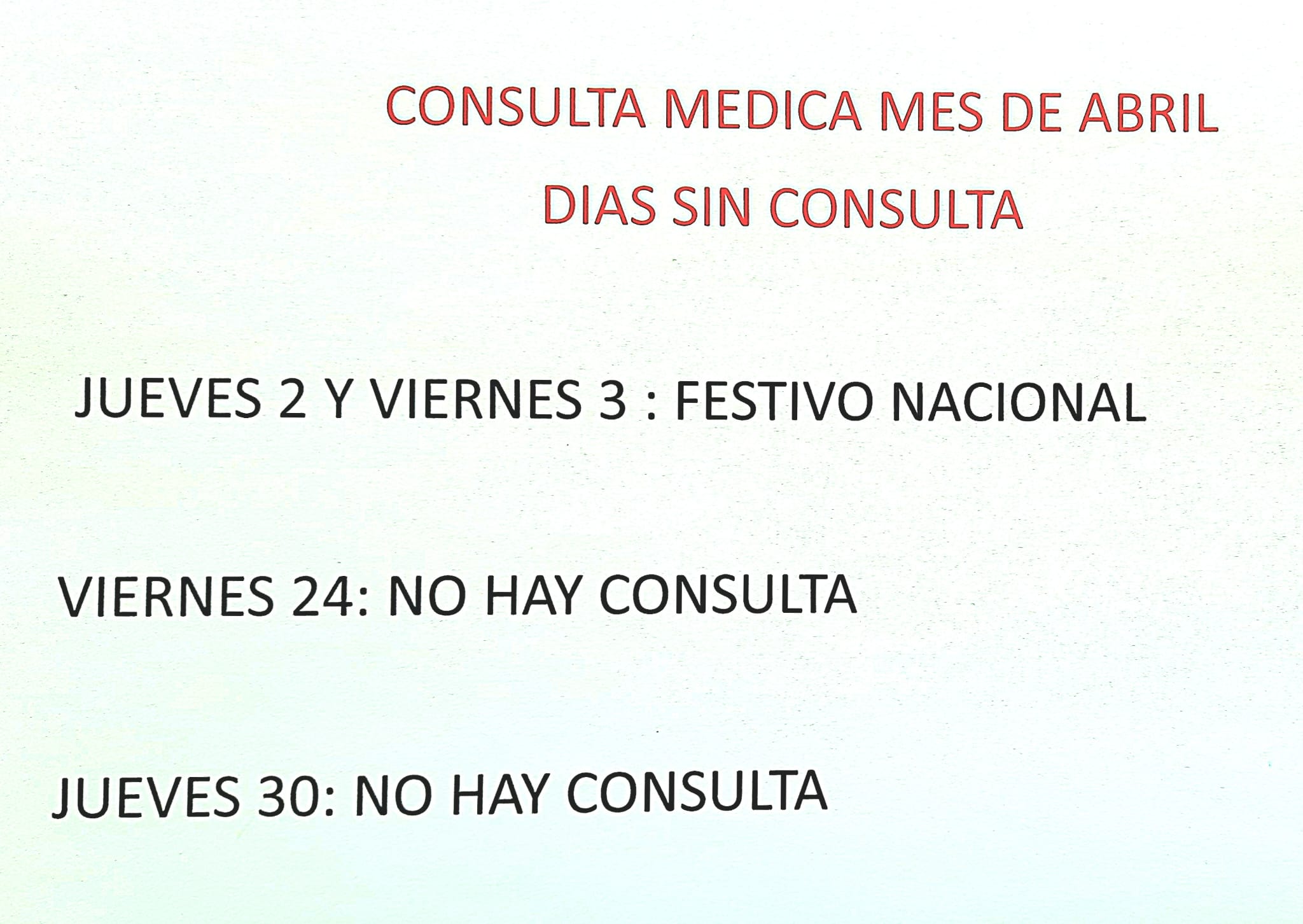 Durante el mes de abril de 2026 no habrá consulta médica en los siguientes días: