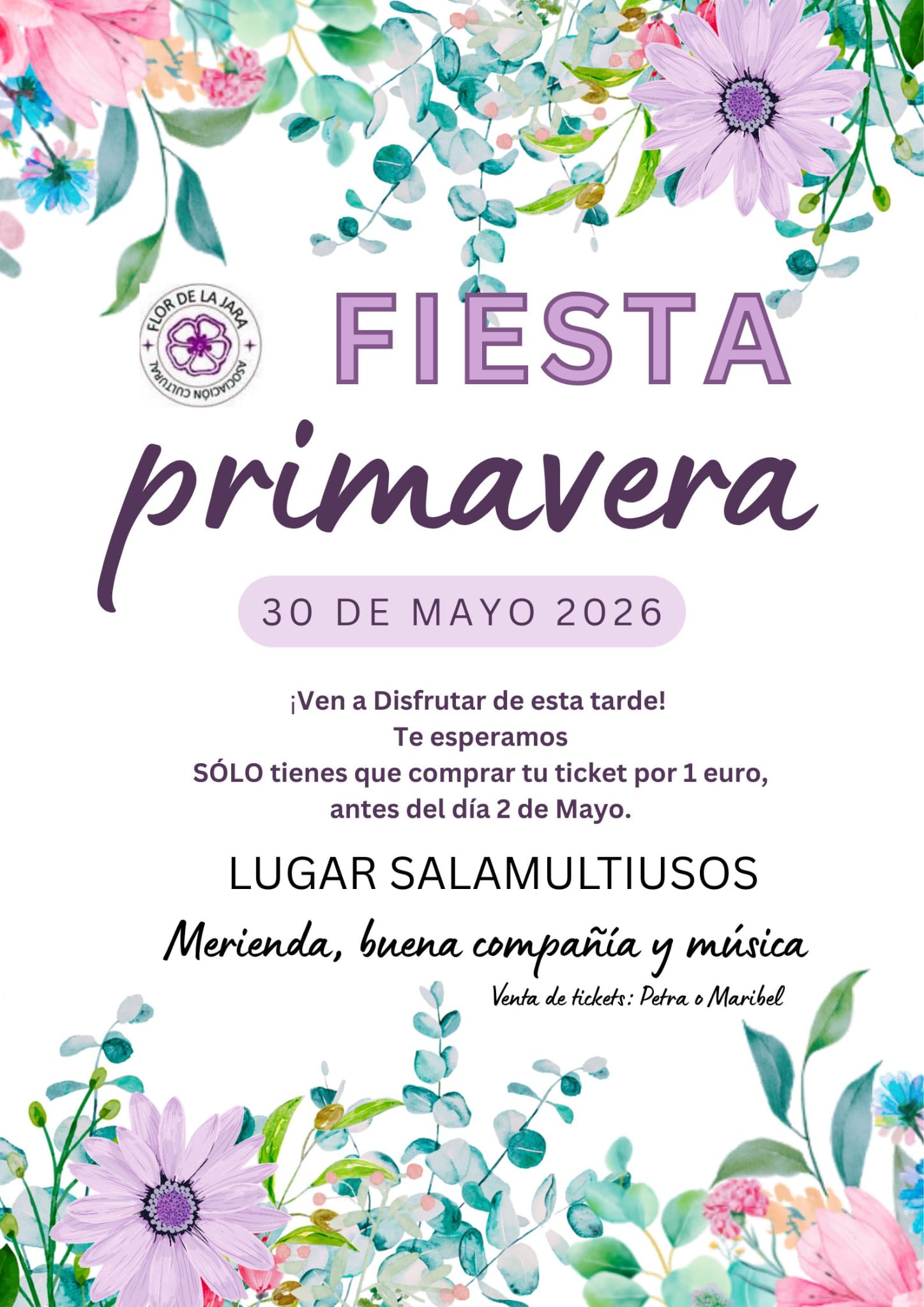 La Asociación Cultural "FLOR DE LA JARA" organiza la FIESTA DE LA PRIMAVERA el 30 de MAYO en la SALA MULTIUSOS.Venta de ticket 1€ a Petra o Maribel