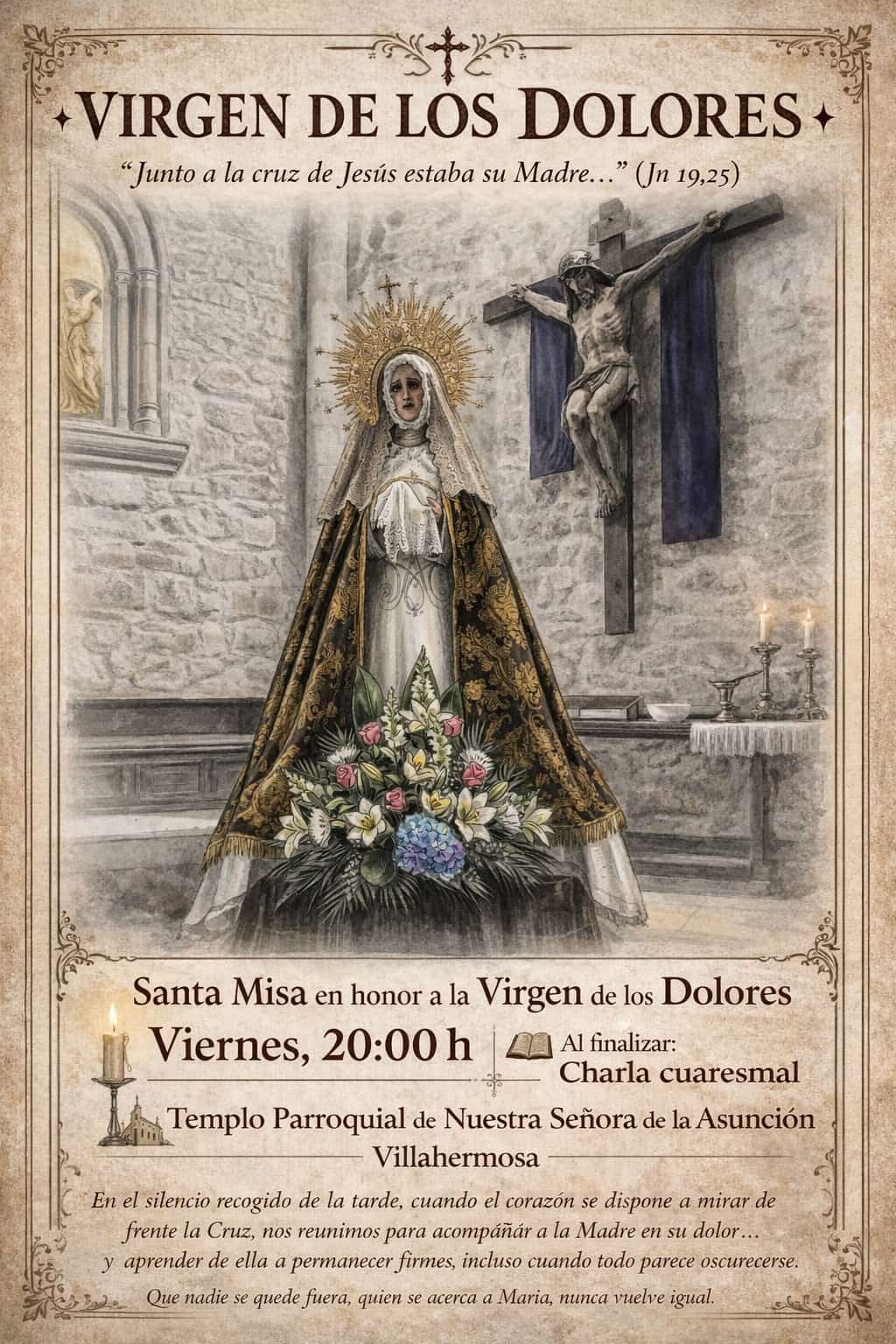 Este viernes 27 de marzo, os invitamos a acompañar a la Virgen de los Dolores en una de las celebraciones más emotivas de nuestra Semana Santa: la Santa Misa en su honor.