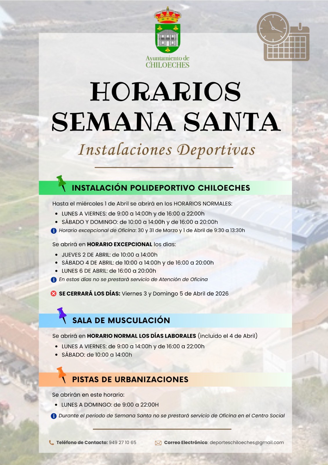 El Ayuntamiento de Chiloeches informa sobre los horarios especiales de las instalaciones deportivas para estos días de Semana Santa.