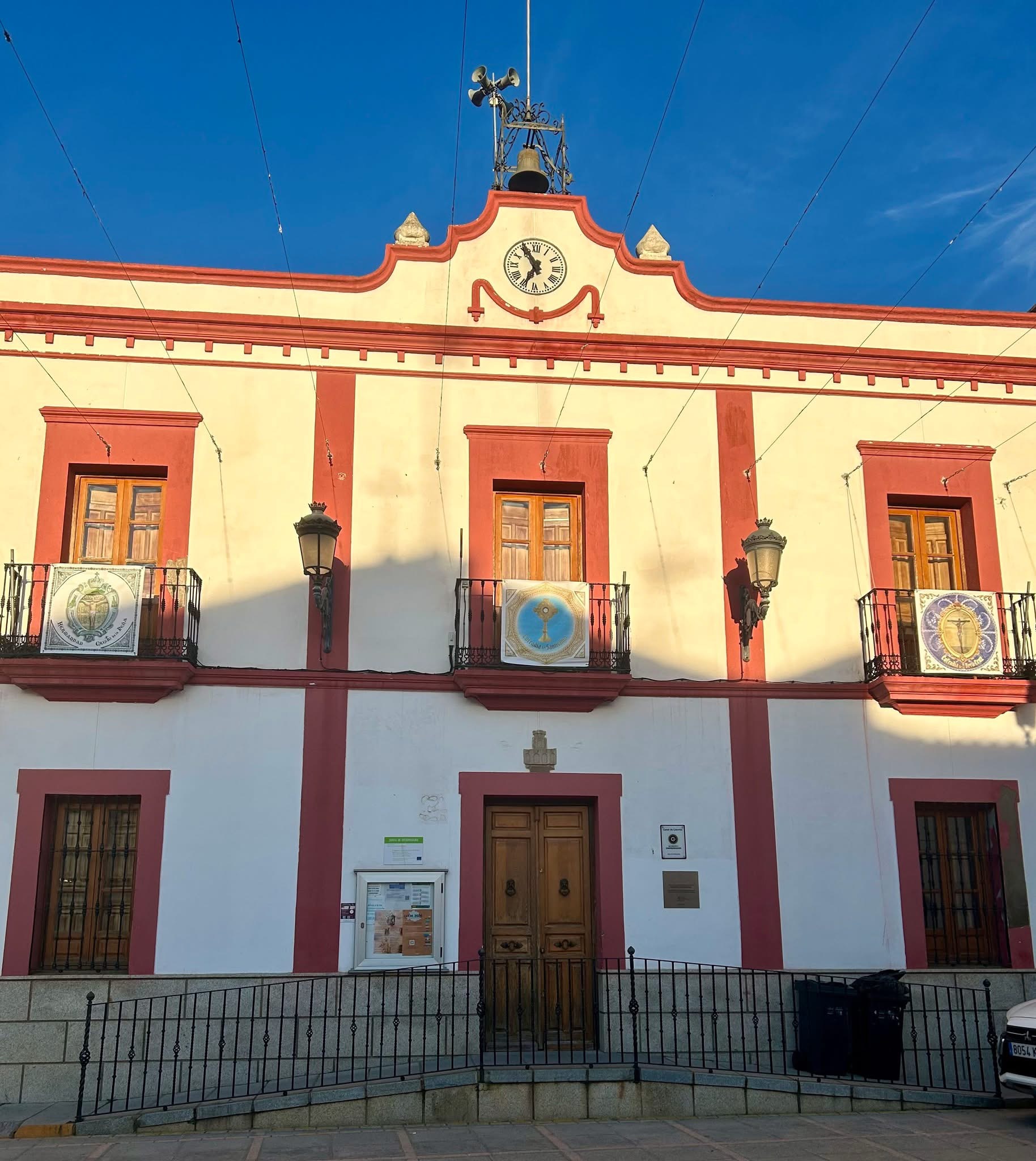 🏛️✅ El Ayuntamiento de Casar de Cáceres se engalana, por segundo año consecutivo, por Semana Santa con los pendones de las cofradías penitenciales casareñas