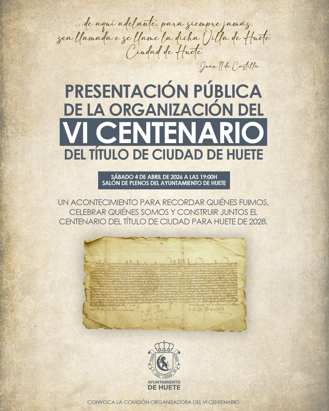 El Ayuntamiento de Huete acogerá el próximo sábado 4 de abril de 2026, a las 19:00 horas, en el salón de plenos, la presentación pública de la organización del VI Centenario del Título de Ciudad de Huete, una cita que marcará el arranque oficial del camino hacia la gran conmemoración de 2028.