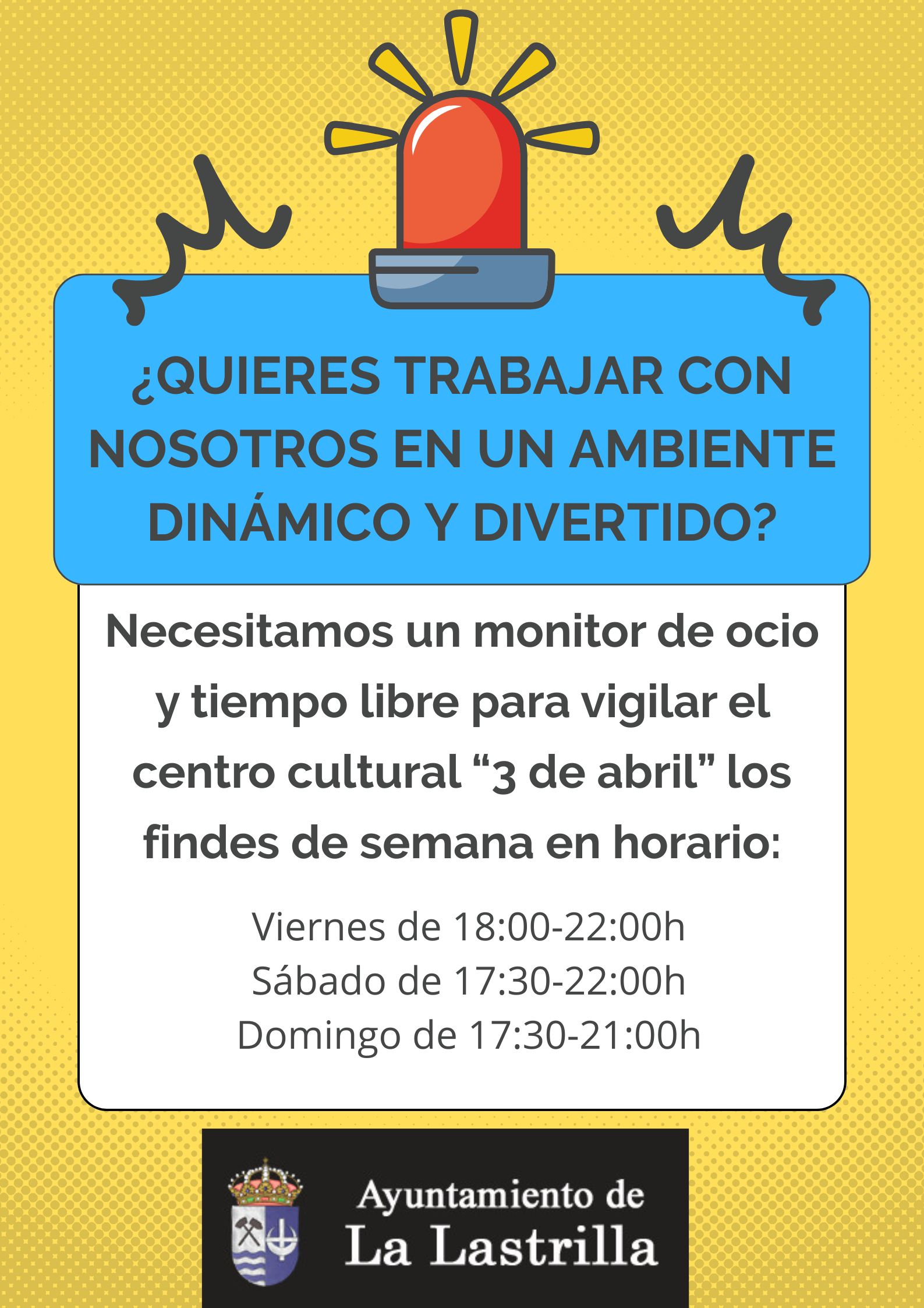 Necesitamos un monitor de ocio y tiempo libre para vigilar el Centro Cultural "3 de abril" los fines de semana en horario: