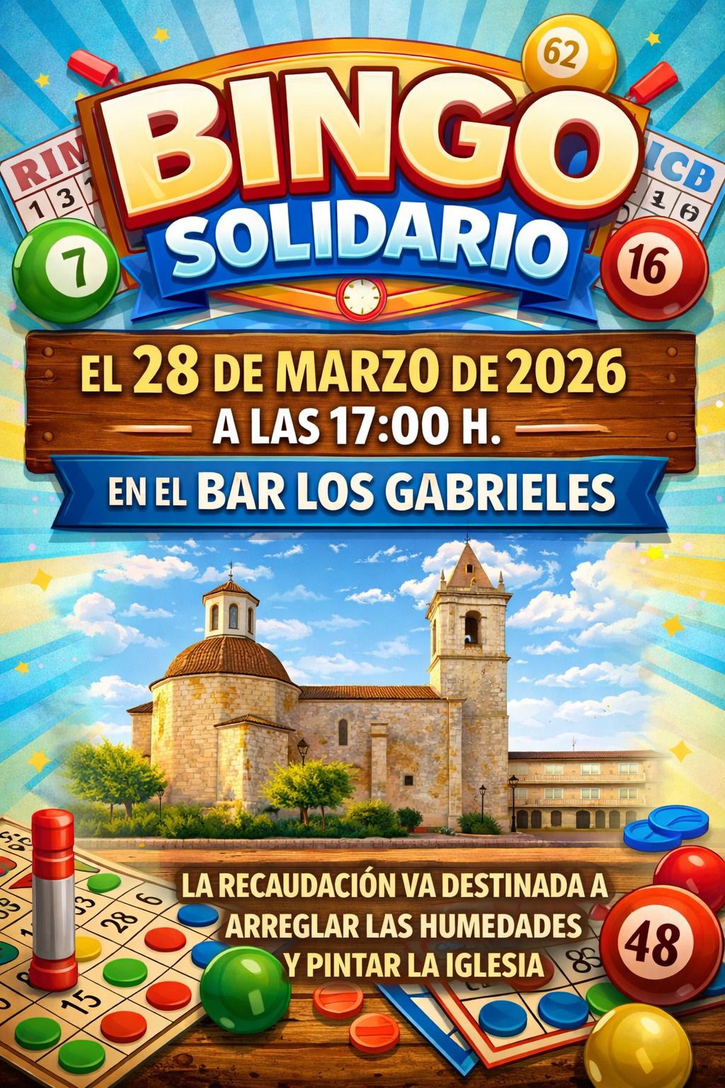 Este sábado 28 de Marzo a las 17:00 en el bar Los Gabrieles, se va a realizar un bingo solidario donde la recaudación irá destinada a arreglar las humedades y pintura de la iglesia de nuestro pueblo.