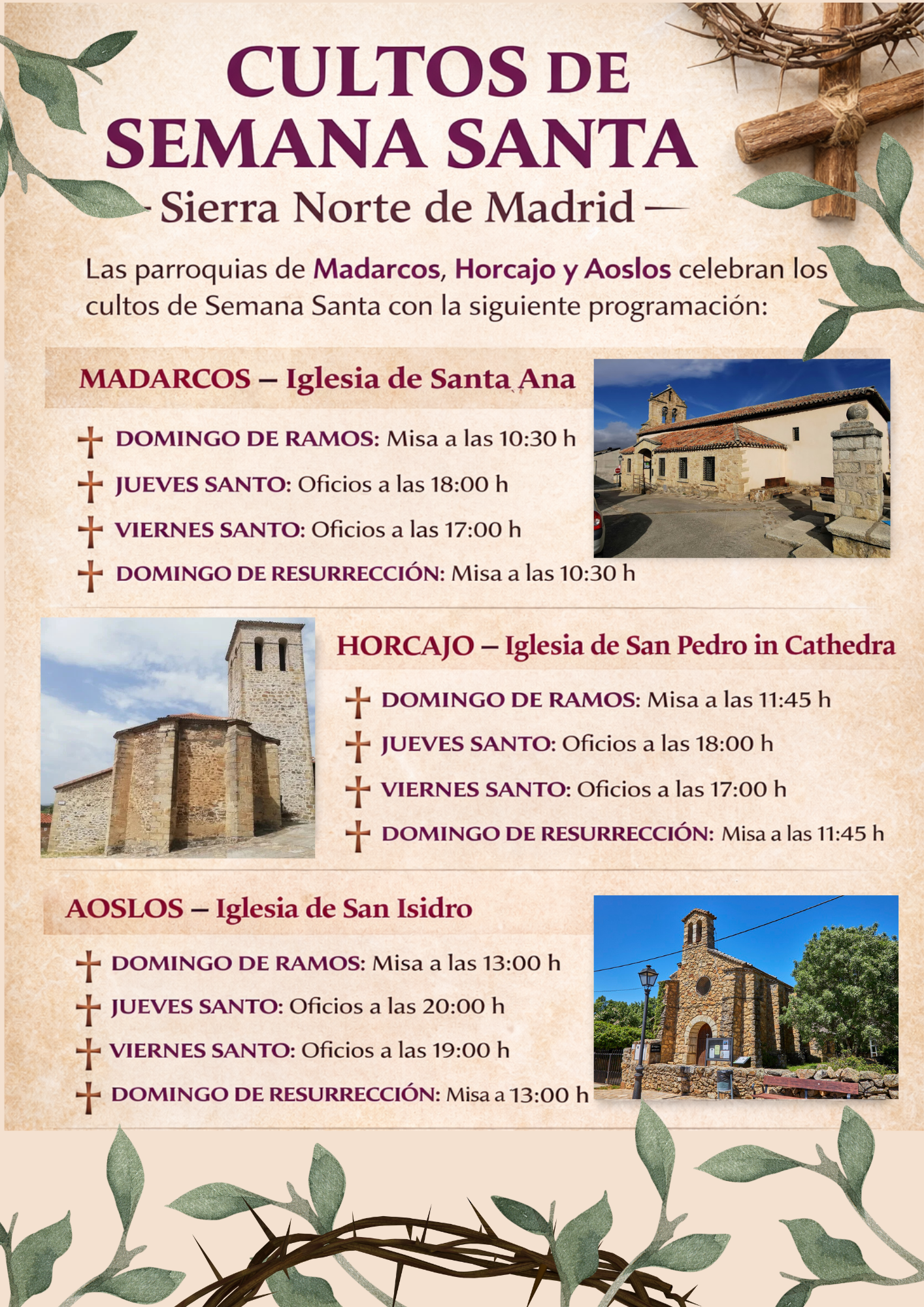 Las parroquias de Madarcos, Horcajo y Aoslos informan de la programación de cultos con motivo de la Semana Santa.