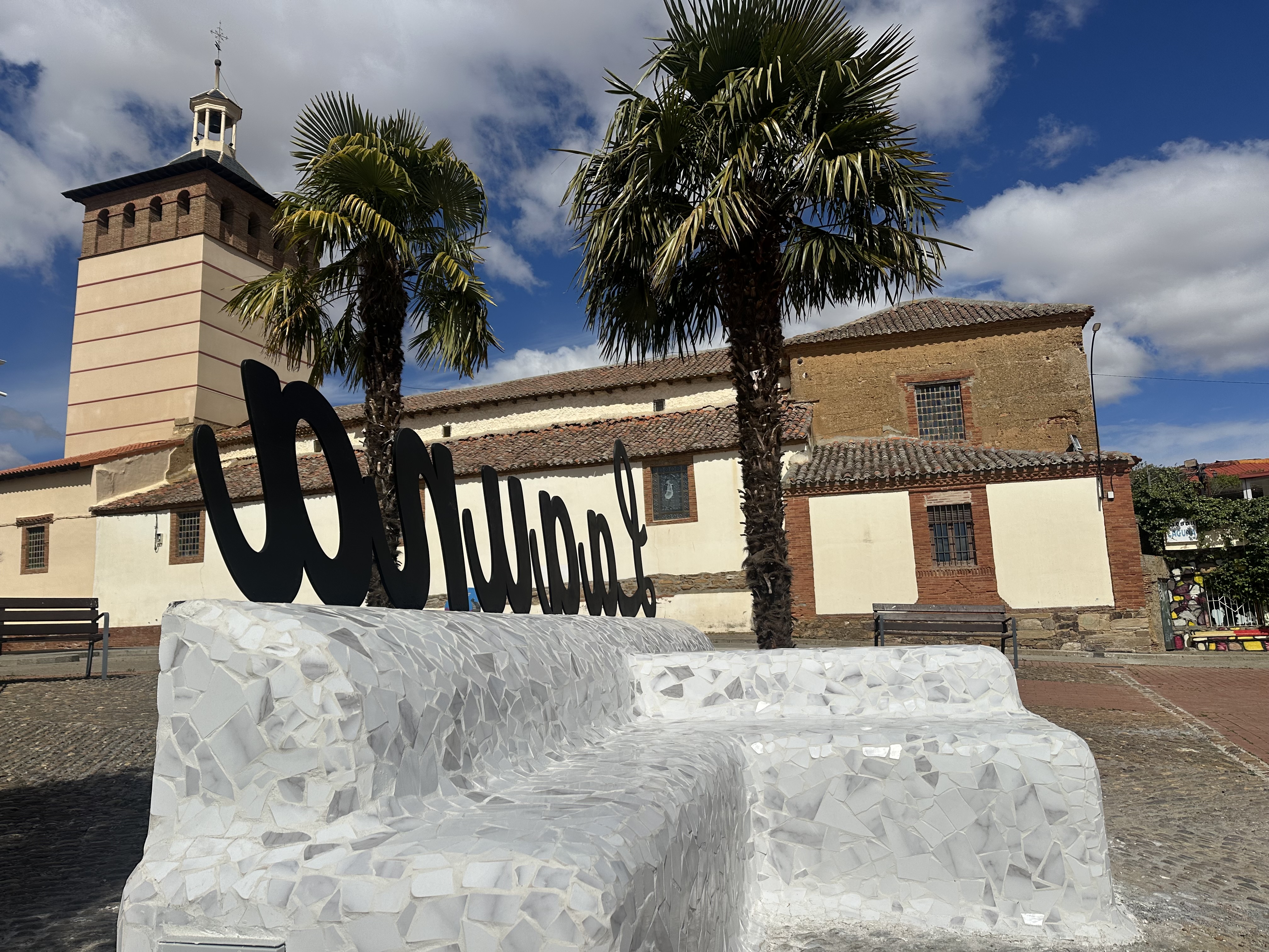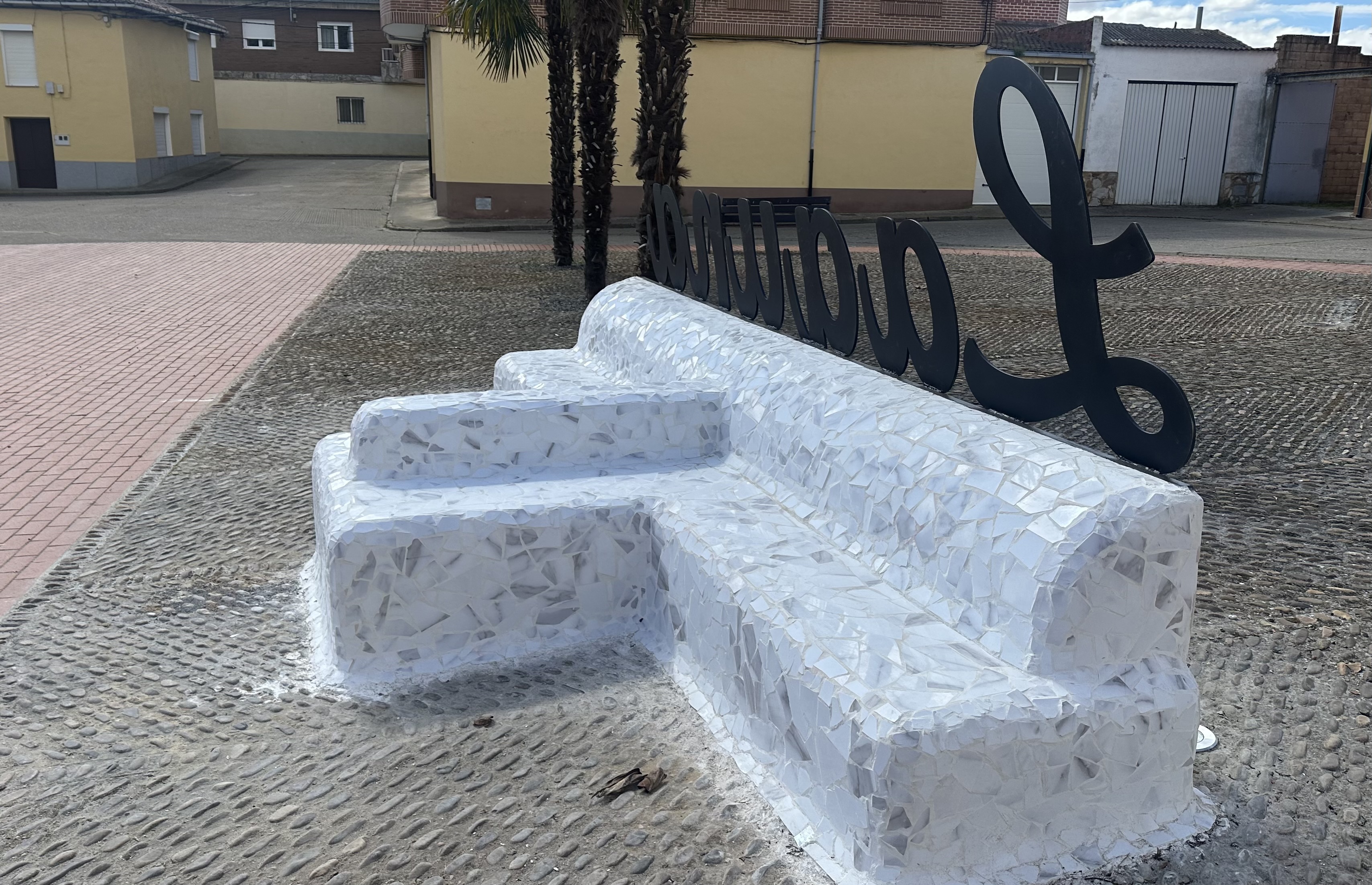 El Ayuntamiento de Laguna de Negrillos ha procedido a construir un banco con unas letras que llevan el nombre de la villa en la Plaza del Castillo.