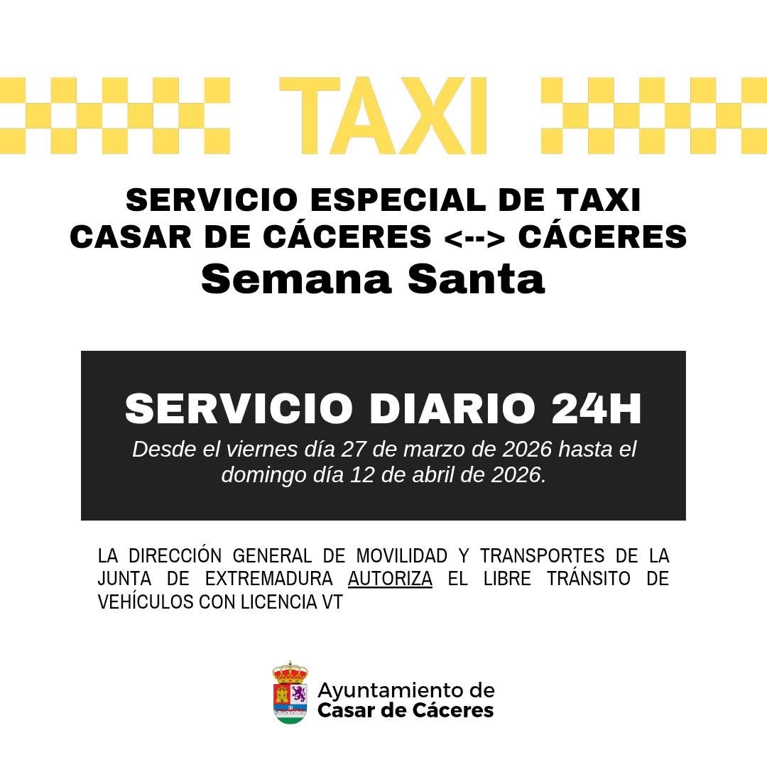 ℹ️ Información sobre el servicio especial de Taxi para Semana Santa autorizado por la Junta de Extremadura tras la solicitud de este Ayuntamiento.#casardecaceres