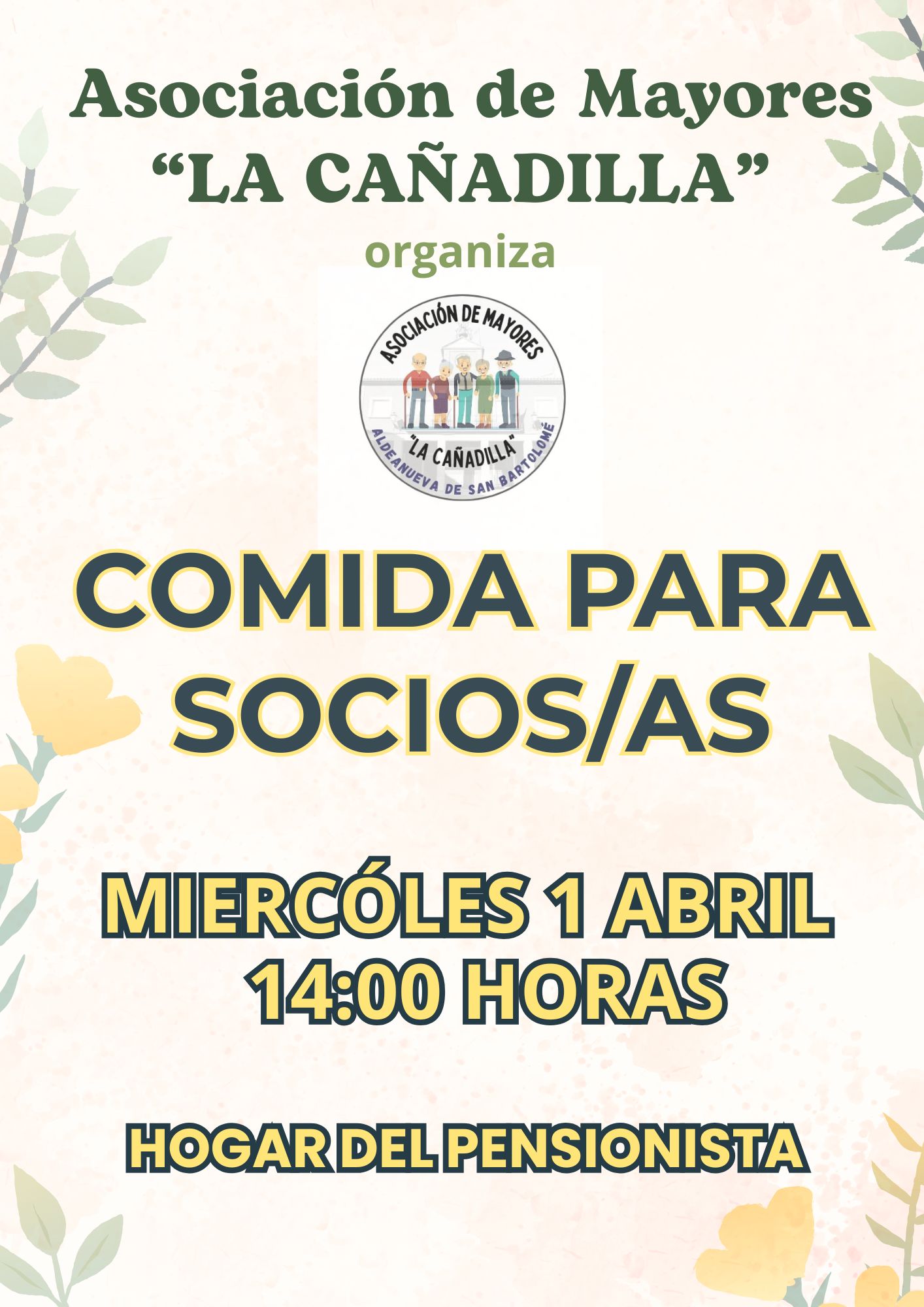 Buenos días,la Asociación de Mayores "LA CAÑADILLA" organiza una comida para sus socios y socias el miércoles 1 de abril a las 14:00 horas en el HOGAR DEL PENSIONISTA.Les esperamos.
