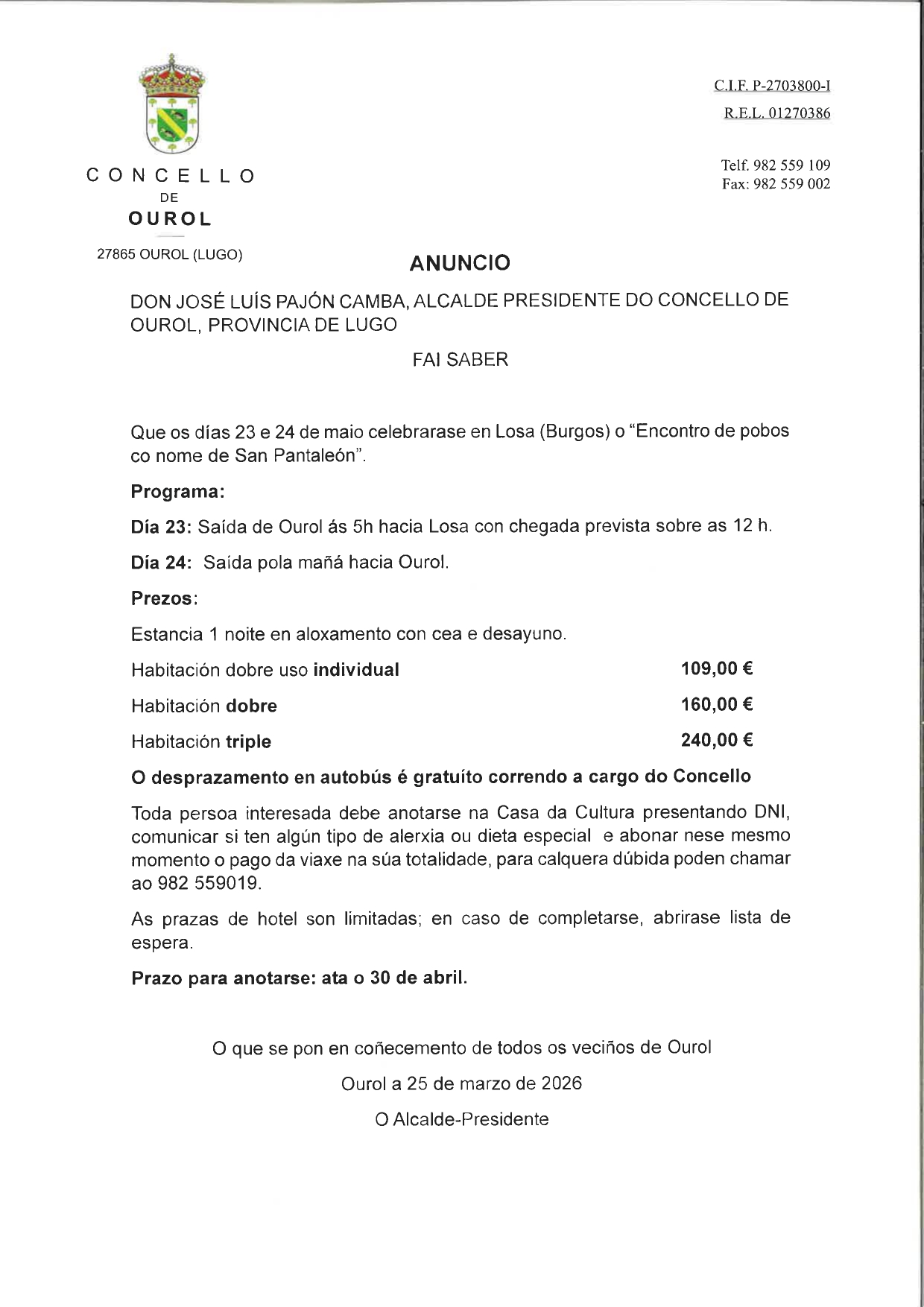 Toda persoa interesada debe anotarse na Casa da Cultura presentando DNI, comunicar si ten algún tipo de alerxia ou dieta especial e abonar nese mesmo momento o pago da viaxe na súa totalidade, para calquera dúbida poden chamar ao 982 559019.