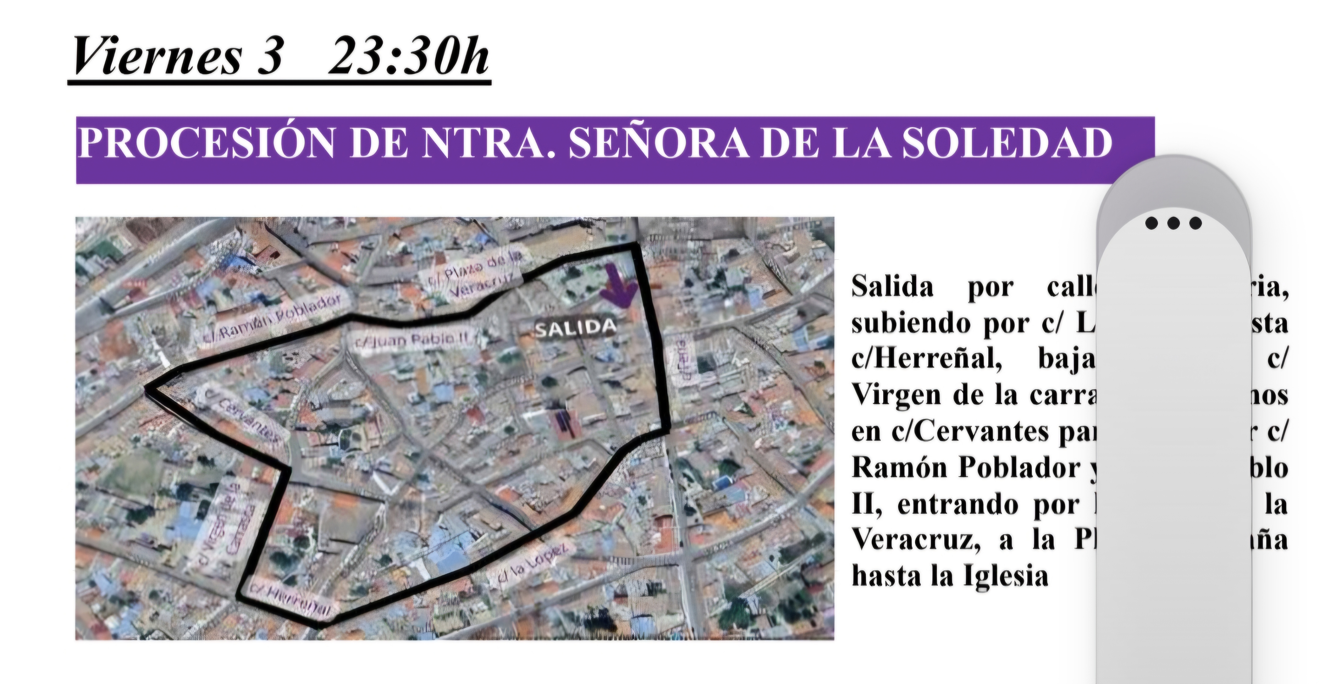 Con motivo de la Procesión de la Soledad, queda prohibido el aparcamiento, entre las 22.30 horas y las 01.00 horas de este viernes día 3 de abril, en las calles que conforman el itinerario de la procesión: