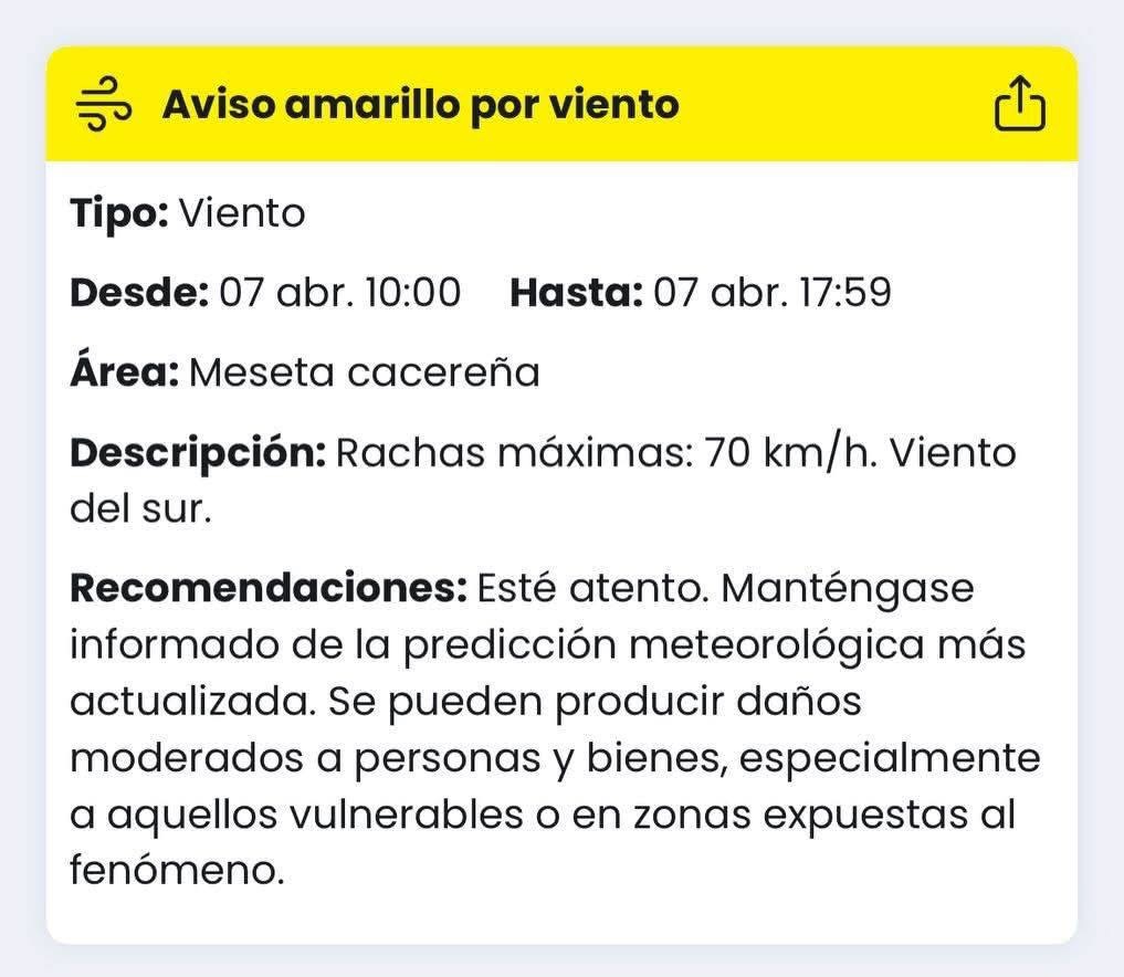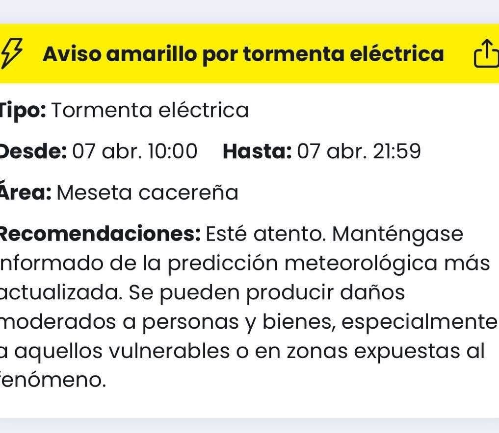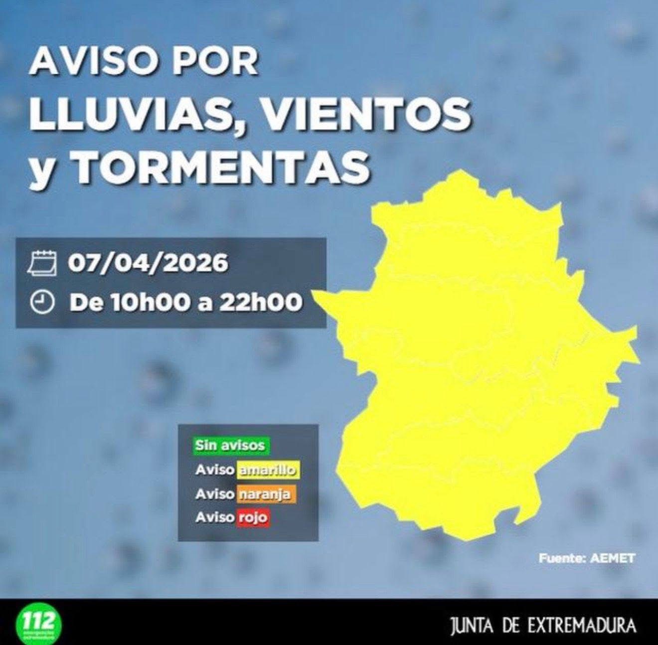 📢 ¡Atención! Este martes, 7 de abril, la comunidad autónoma de Extremadura estará en alerta por lluvias, vientos y tormentas. Por favor, tened precaución y, en caso de emergencia, contactad con el 112.