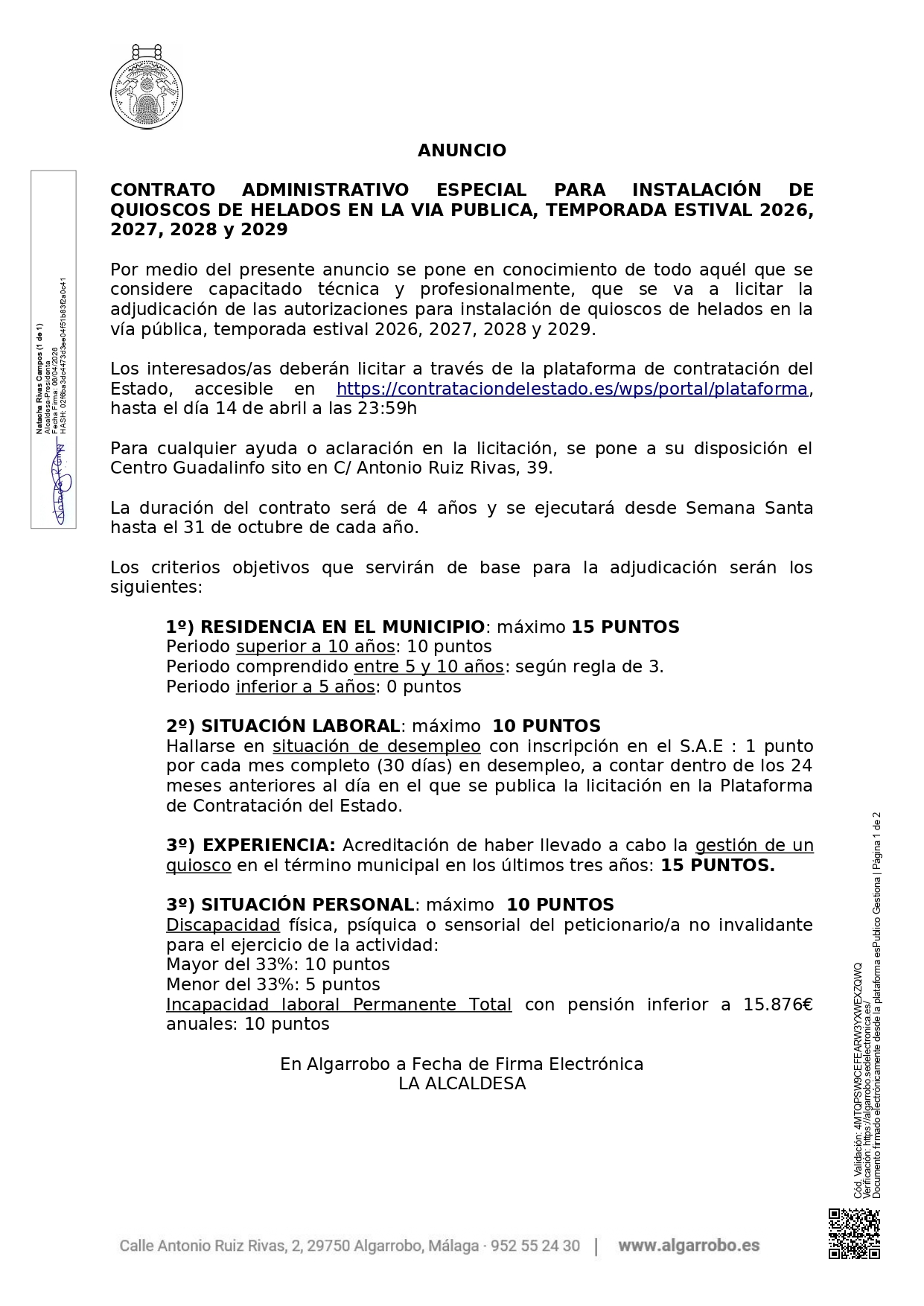 🏖️ El Ayuntamiento abre licitación para instalar quioscos de helados en la vía pública durante las temporadas estivales de 2026, 2027, 2028 y 2029.