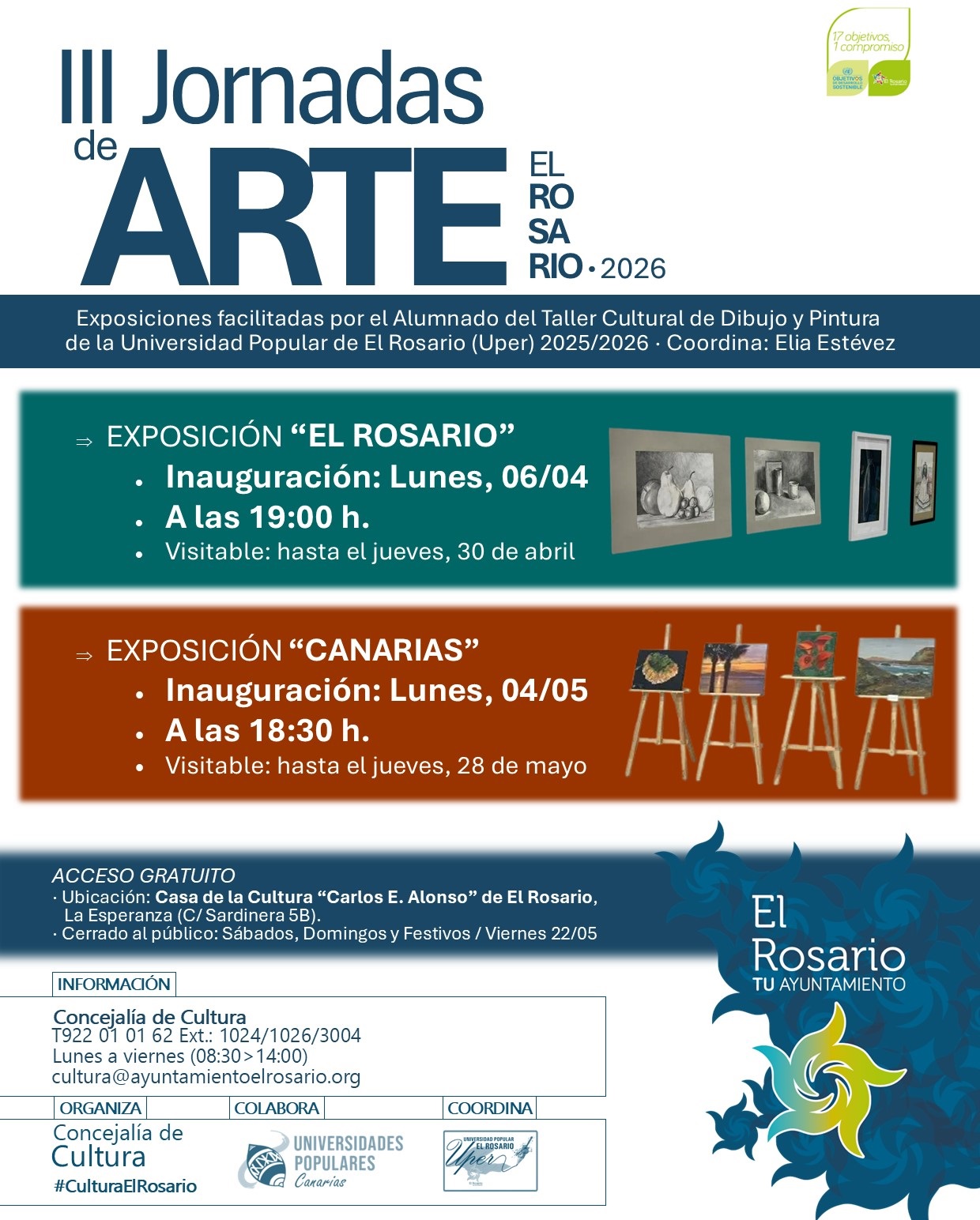 La Casa de la Cultura βCarlos Alonsoβ de El Rosario, en La Esperanza, acoge la tercera ediciΓ³n de las Jornadas de Arte, abriendo su sala de exposiciones al colectivo de vecinos y vecinas del Municipio que integran el Taller de Dibujo y Pintura de la Universidad Popular de El Rosario, que coordina su profesora Elia EstΓ©vez Art, graduada en Bellas Artes por la Universidad de La Laguna.