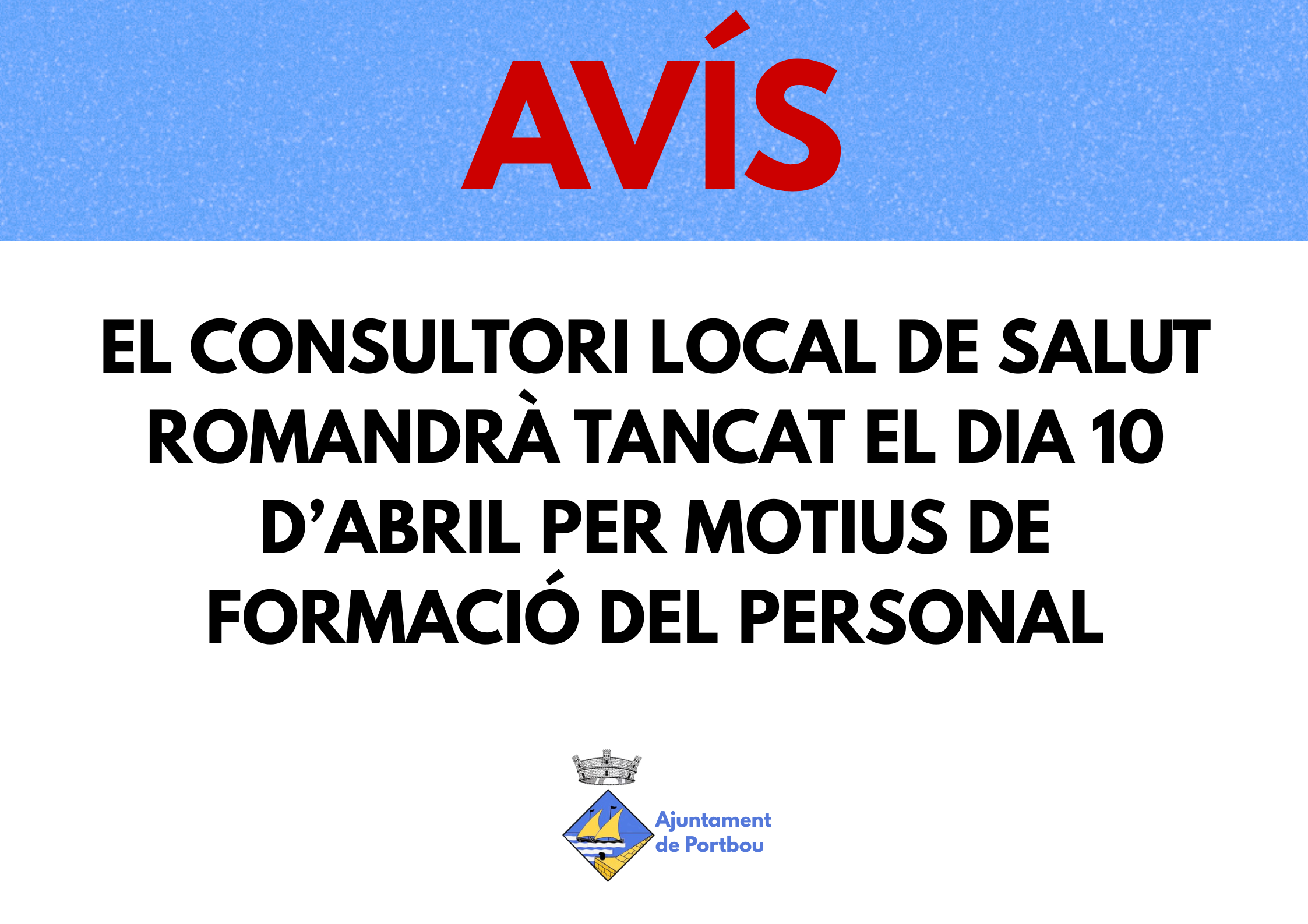 El consultori local de salut romandrà tancat el dia 10 d'abril per motius de formació del personal.Disculpeu les molèsties.