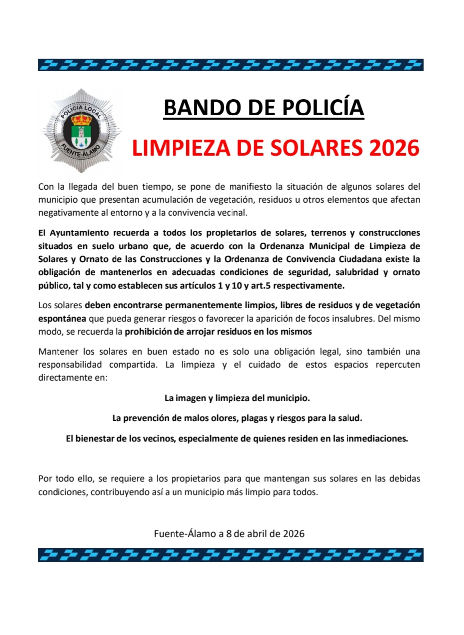 ¡Limpieza de solares! 🧹🧼Os dejamos Bando sobre Limpieza de solares. 📜📄Mantener los solares en buen estado no es solo una obligación legal, sino también una responsabilidad compartida. 🤝🌍