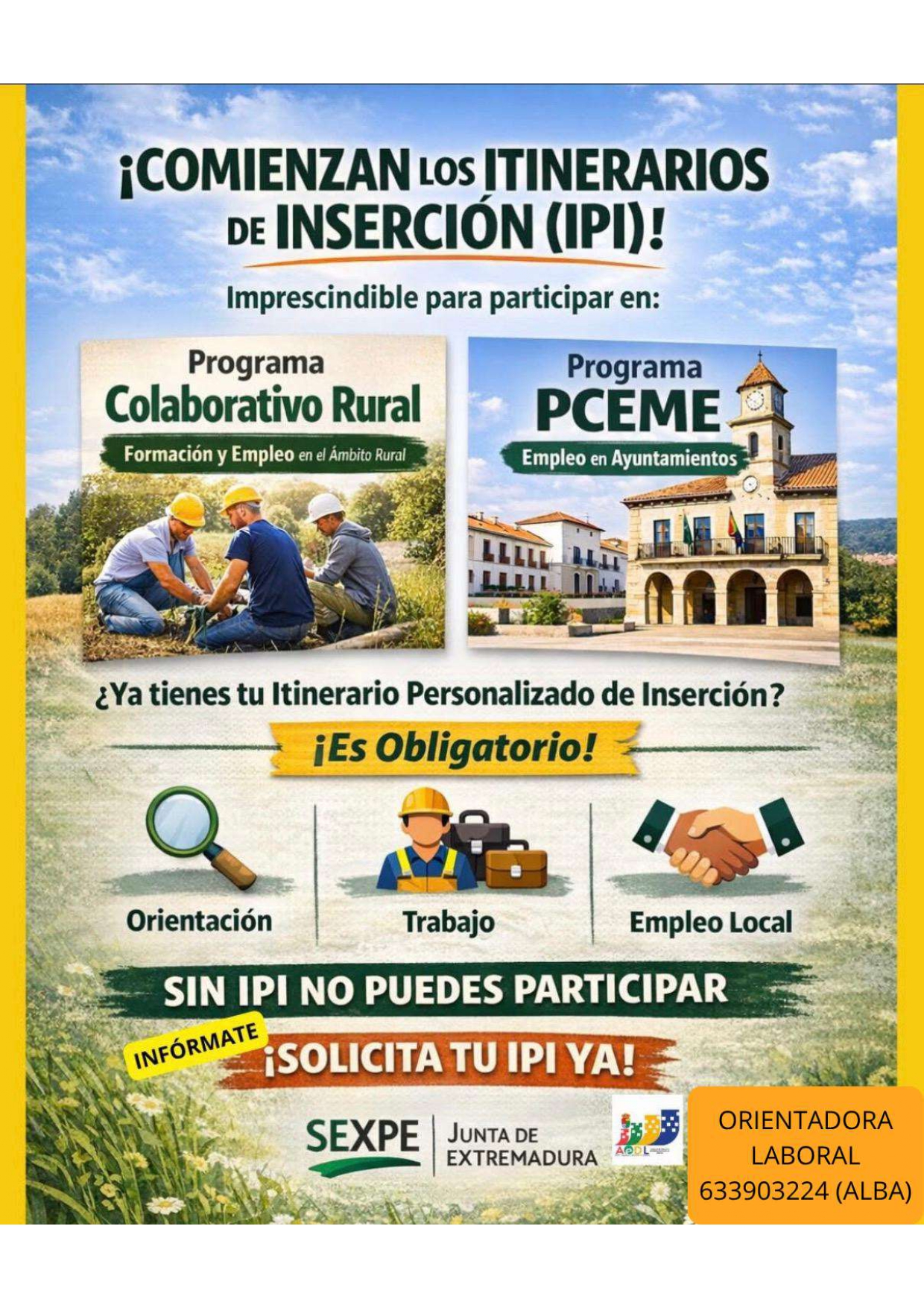 Se adjunta cartel informativo acerca de los itinerarios personalizados de inserción (IPI).Para más información contactar con la orientadora laboral en el Ayuntamiento (lunes y viernes de 08:00 a 14:30).