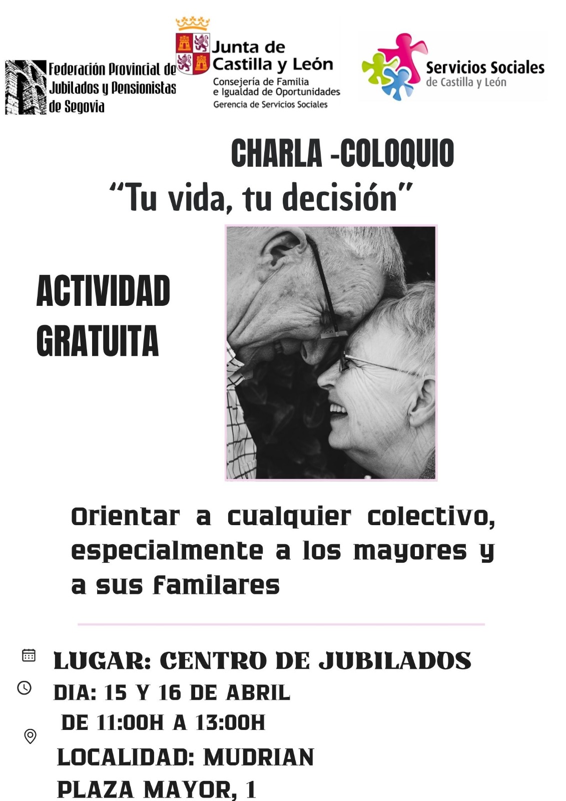 La Asociación de Jubilados 'Arroyo Malucas', en colaboración con la Federación de Jubilados y Pensionistas de Segovia, organiza una charla-coloquio titulada «Tu vida, tu decisión».